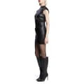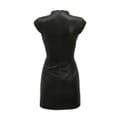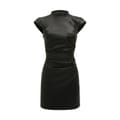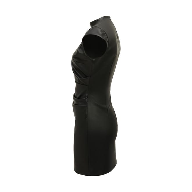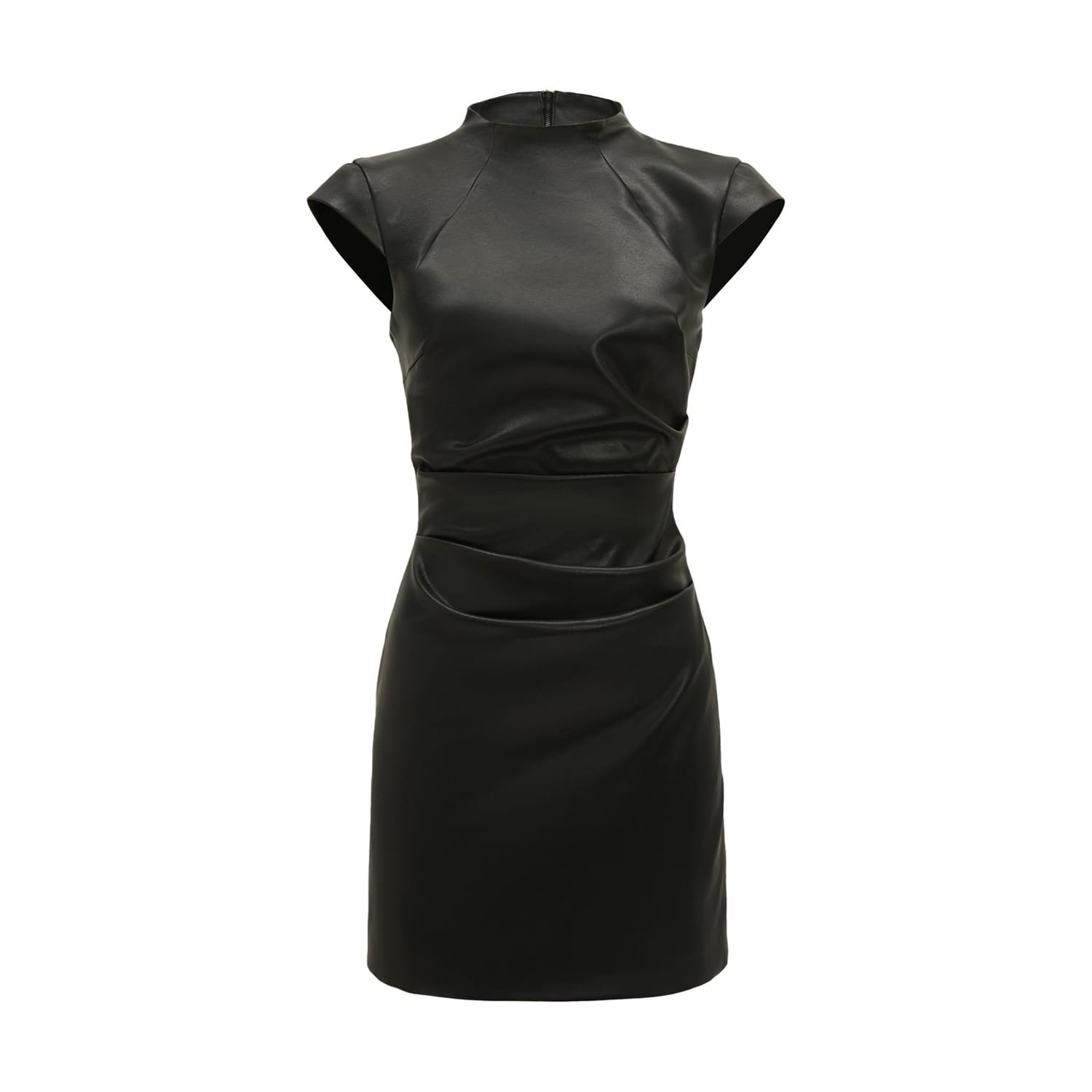 The Naja Vegan Leather Mini Dress is crafted in a bold vegan leather silhouette, and it features a mini-length cut with a high neckline, extended sleeves, soft gathers for shaping and a concealed zip closure.