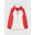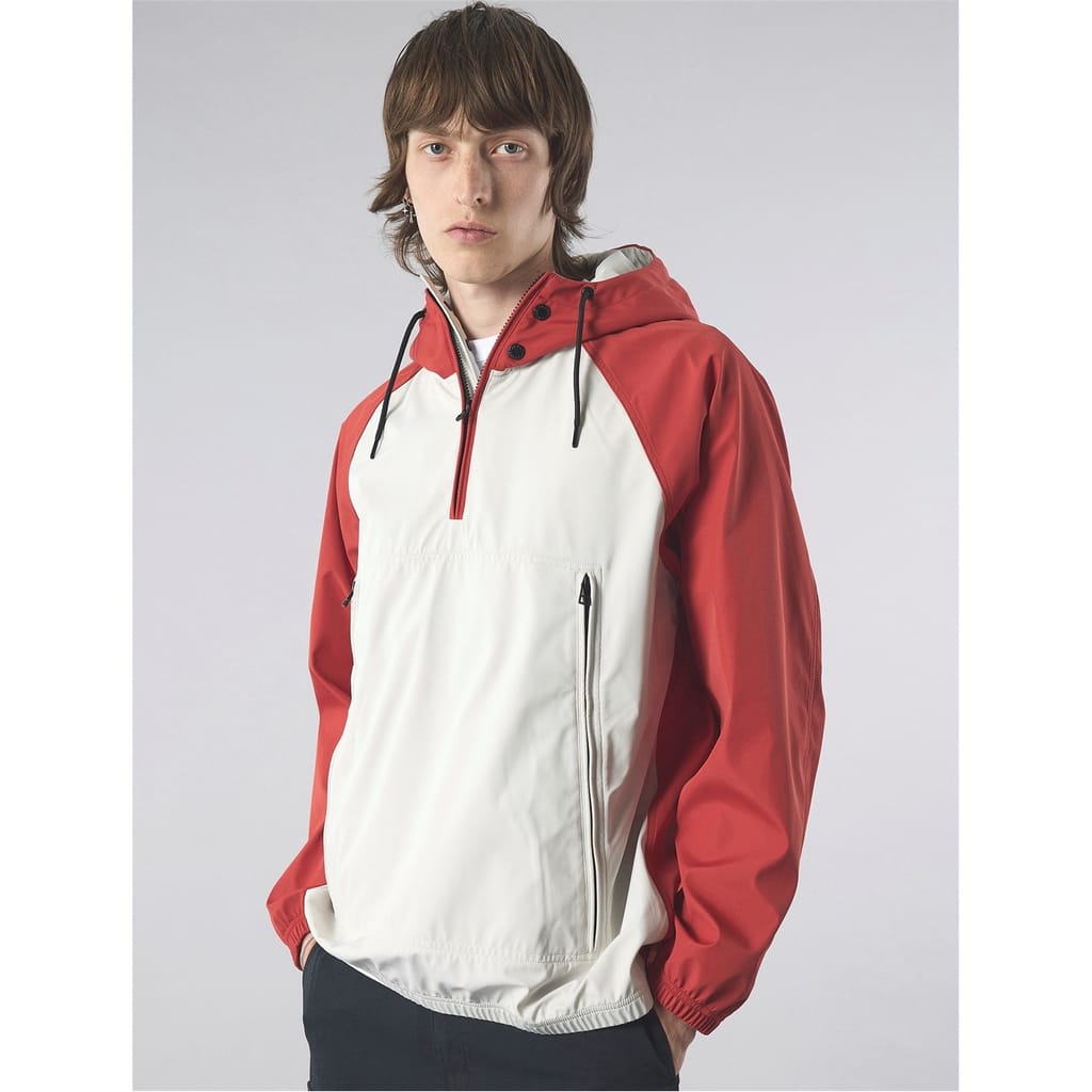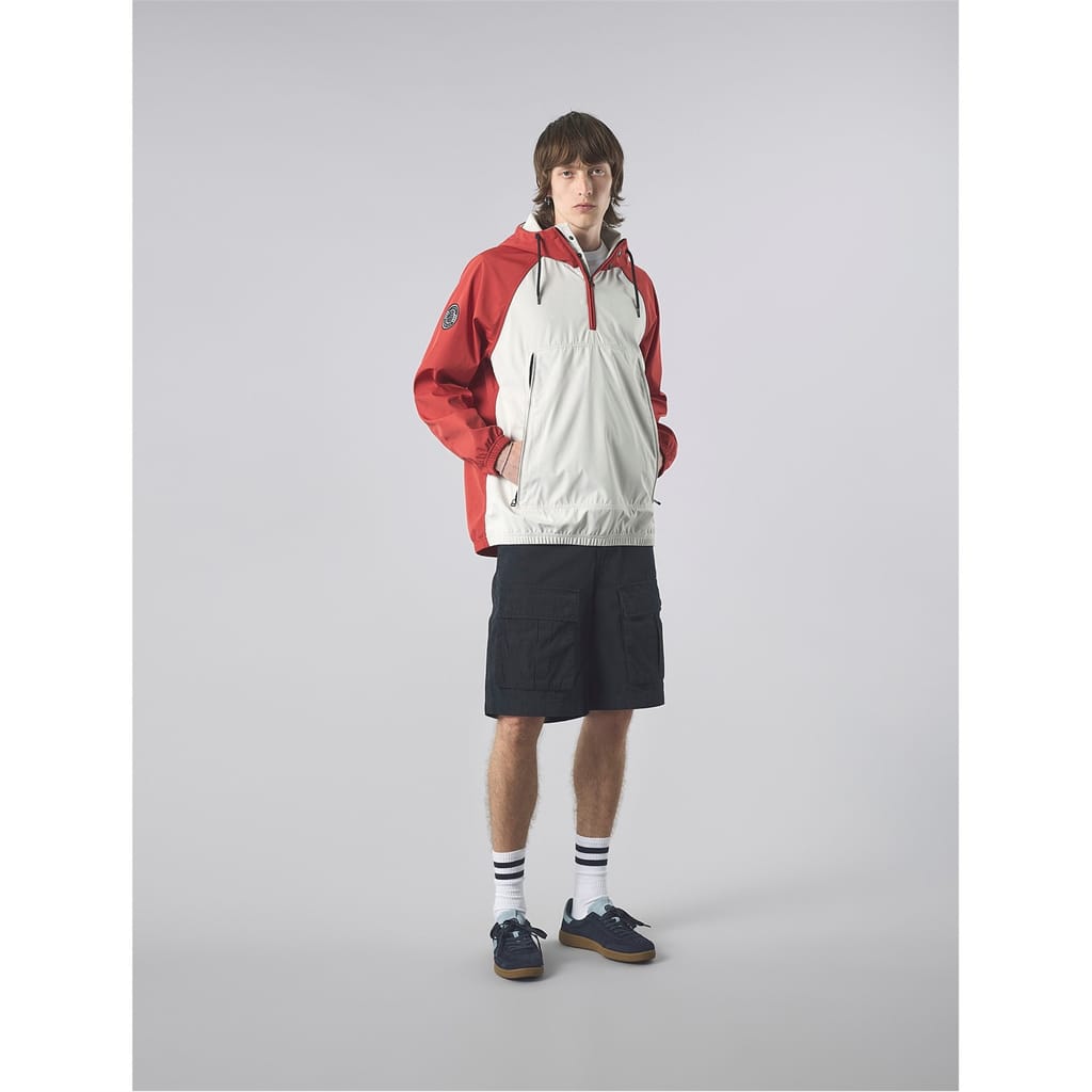 The Pretty Green Travis overshirt features a relaxed fit with a short length and a straight hem. It showcases a colour block pattern and is adorned with smocked details, pockets, a badge, and a logo. The design includes a hooded neckline, raglan sleeves, and elasticated cuffs. The jacket is equipped with a zipper and snap button closure for added functionality. -