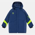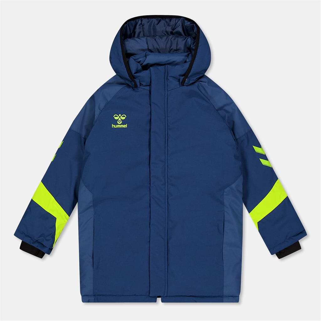 The Hummel bench jacket is a heavy-weight piece designed for warmth and style. Featuring a hooded neckline and a regular fit, it offers a comfortable wear. The jacket includes a zipper closure and snap buttons for added security. The ribbed cuffs and straight hem enhance its practicality. The color block pattern and logo embellishment add a distinctive touch. -