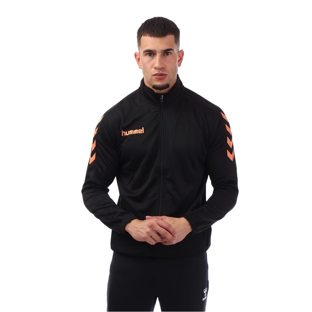 This Hummel track jacket from the activewear collection features a zip neck and a solid pattern. Designed with a regular fit, it includes a zipper closure, ribbed cuffs, and a ribbed hem for added comfort. The jacket is embellished with a logo, adding a touch of brand identity to its sleek design. -