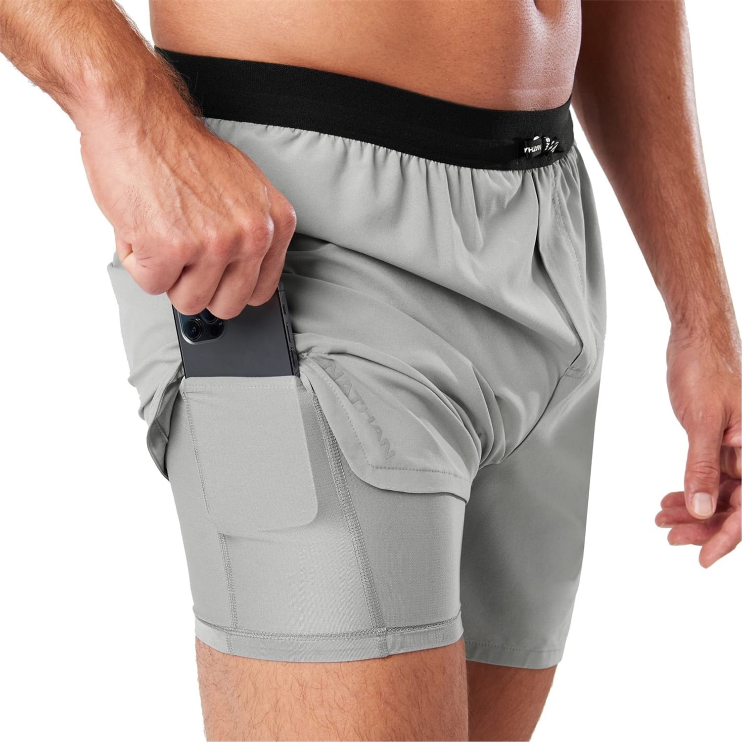 Nathan running shorts are designed for performance, featuring a solid pattern and a drawstring closure. Part of the activewear collection, these athletic shorts include multiple pockets such as a phone pocket, security pocket, zipped pocket, and inner pocket, ensuring convenience and functionality during your run. -