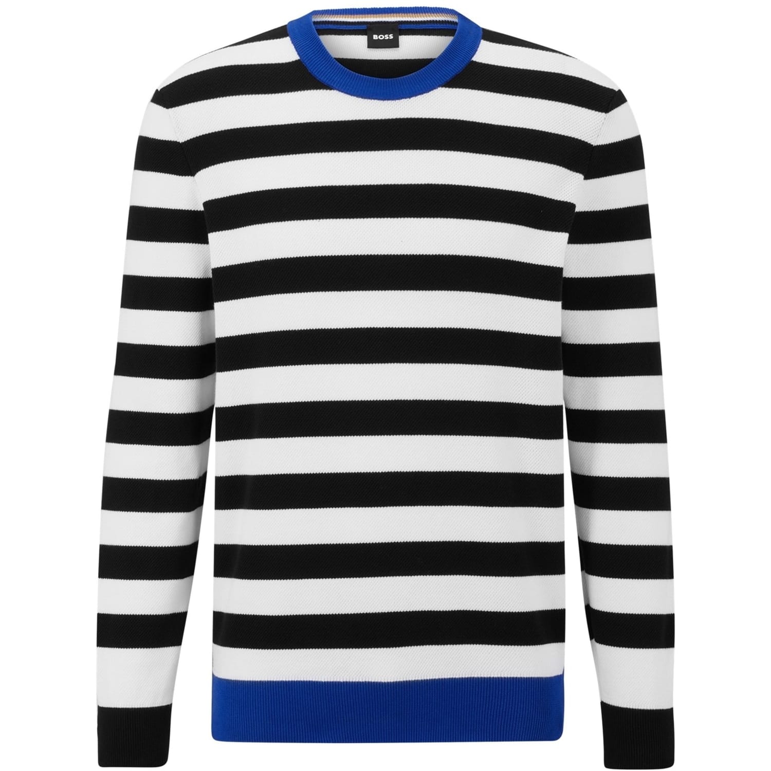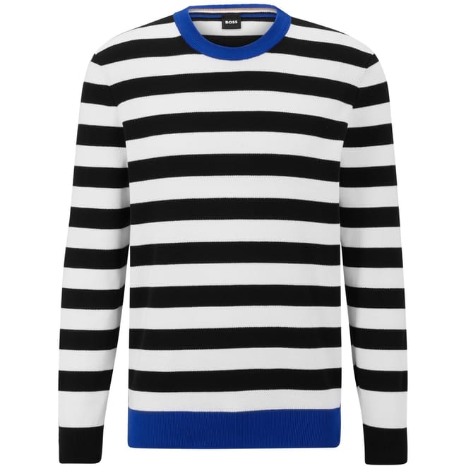 This Boss top features a classic crew neck and long sleeves, offering a regular fit for comfortable wear. The design is enhanced with horizontal stripes, while ribbed cuffs and collar add a touch of detail. -