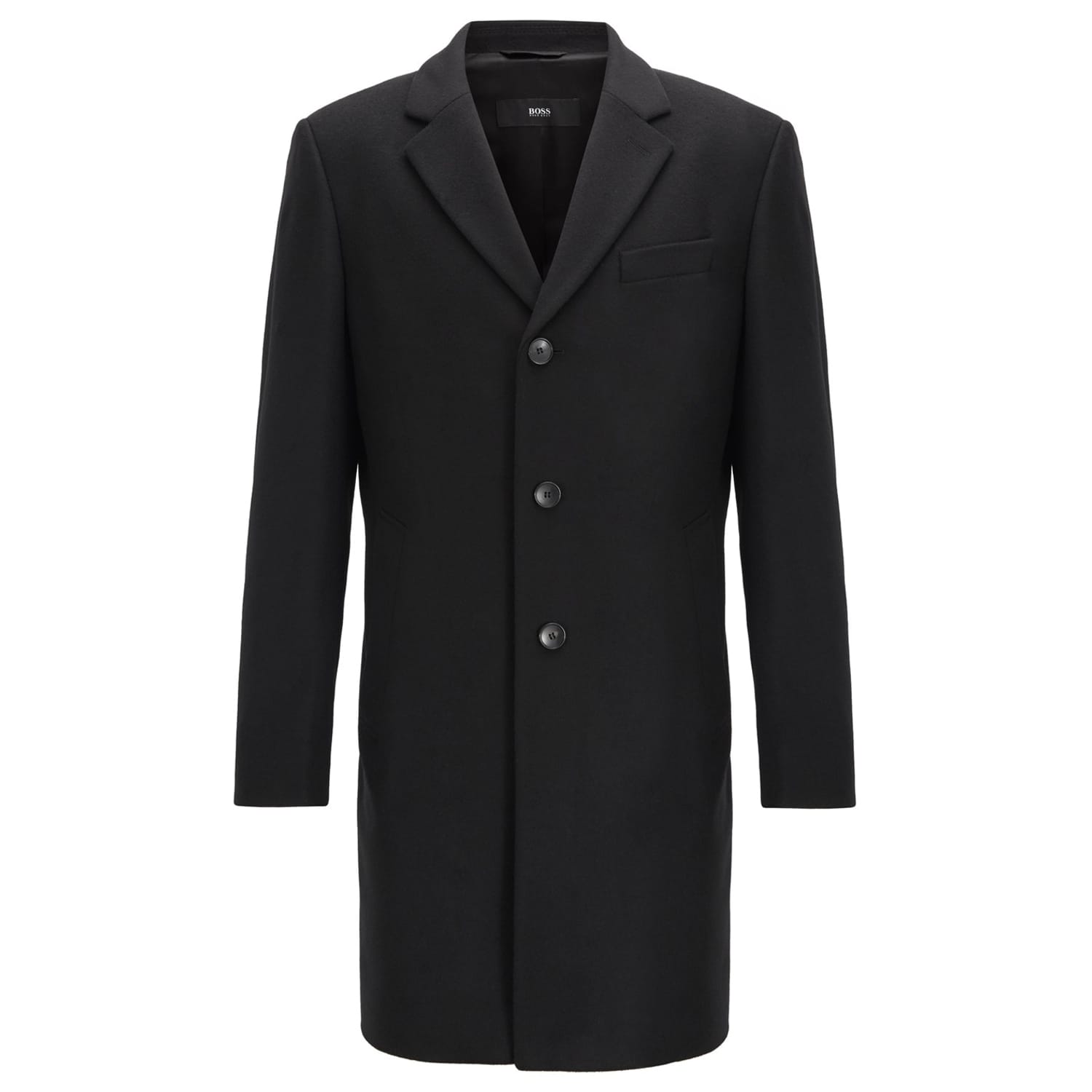 This Boss overcoat from the formal collection features a notch collar and a straight hem. Crafted in a solid pattern, it offers a regular fit with a button closure. The design is completed with a subtle logo embellishment, adding a touch of sophistication to this classic piece. -