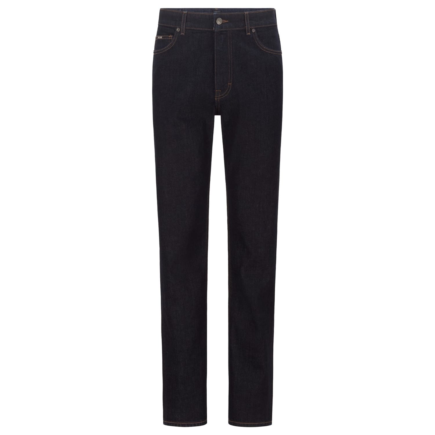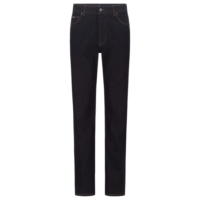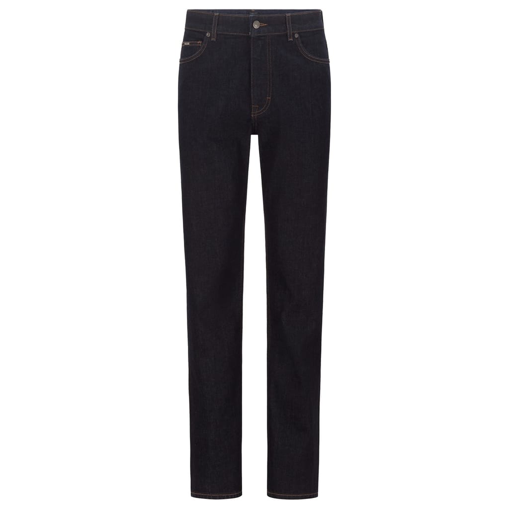 The Boss Albany jeans feature a slim fit with a classic five-pocket design. These jeans are equipped with a zip fly, front button, and belt loops for a secure fit. The design includes practical embellishments such as pockets, a coin pocket, and detailed stitching, offering both style and functionality. -