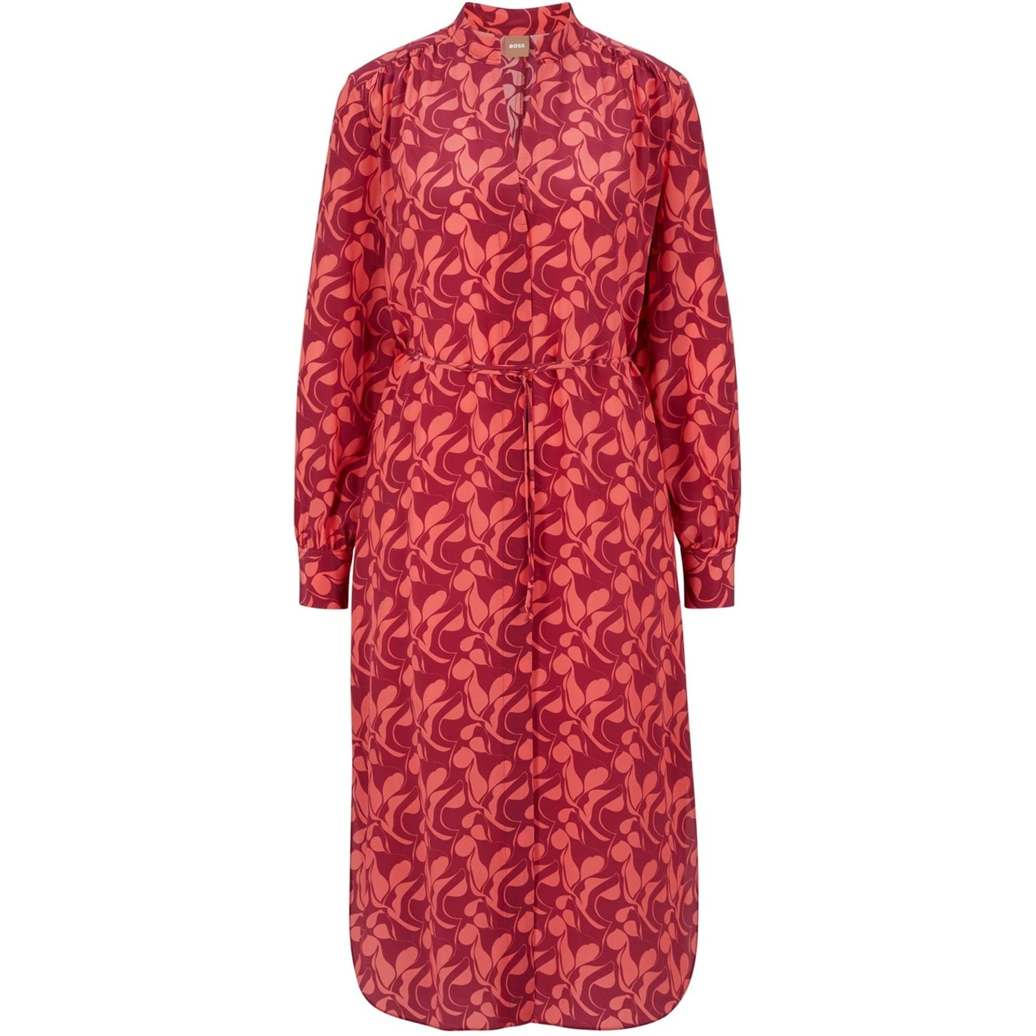 This Boss shirt dress features a midi length and a band collar, offering a sophisticated look. The abstract pattern adds a modern touch, while the tie waist closure ensures a flattering fit. The dress is designed with a collared neck and long sleeves, finished with a straight hem. A subtle logo embellishment completes the regular fit design, making it a versatile addition to any wardrobe. -