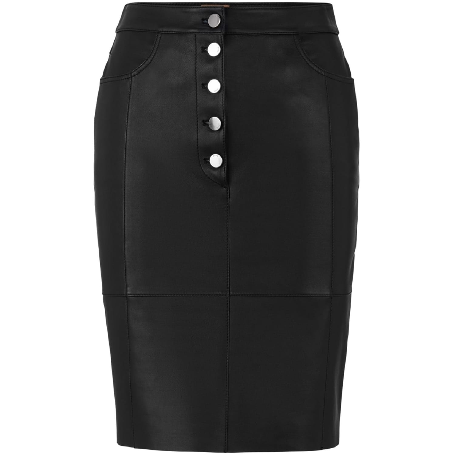 This Boss pencil skirt is a sophisticated addition to your casual collection. Designed with a knee-length cut, it features a regular fit for comfort. The skirt is detailed with a button closure and front pocket, adding practicality to its sleek design. The subtle stitching and button placket embellishments enhance its refined look, making it a versatile piece for various occasions. -
