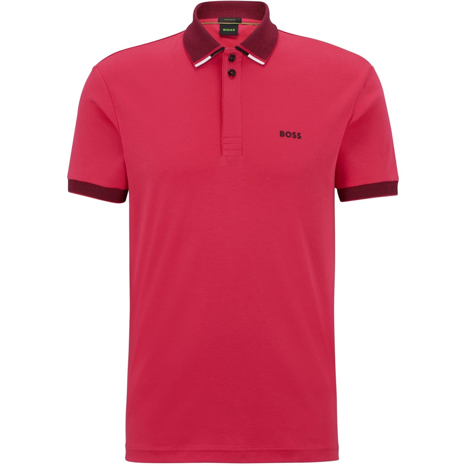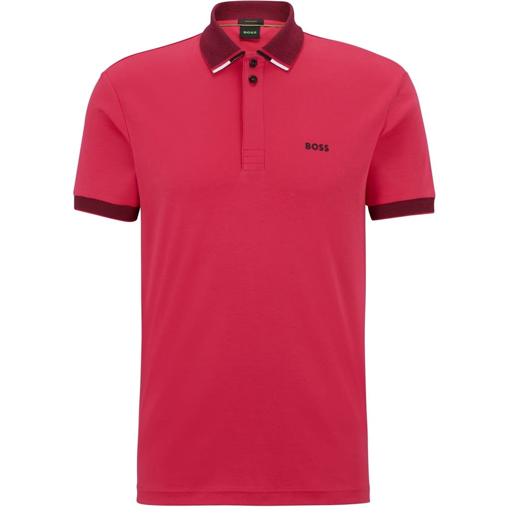 This Boss top features a classic polo collar and a button closure, offering a regular fit. The short sleeves are complemented by ribbed cuffs, adding a touch of detail to the solid pattern. A subtle logo embellishment completes the design, making it a versatile addition to any wardrobe. -