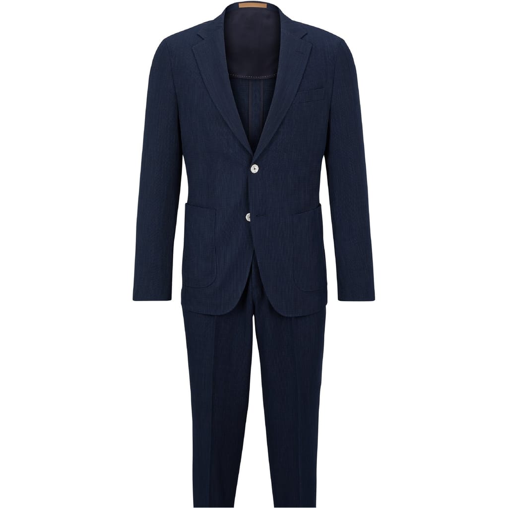 This Boss suit jacket features a classic notch collar and a straight hem, offering a timeless appeal. Designed with a solid pattern, it ensures a sleek and sophisticated look. The jacket is tailored in a regular fit and includes a button closure for a refined finish. Ideal for formal occasions, this two-piece set embodies elegance and style. -