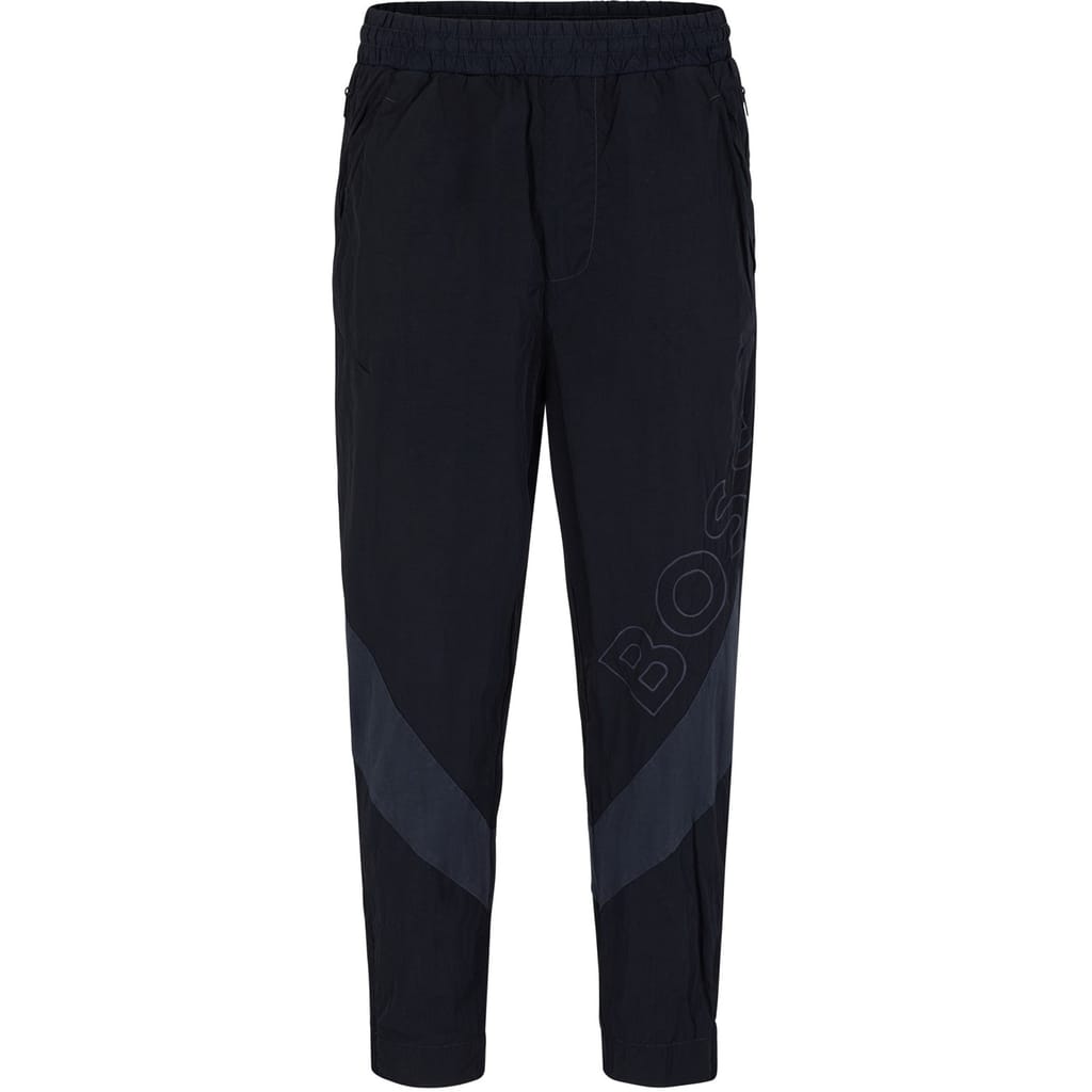 Boss joggers feature a regular fit with an elasticated waistband for comfort. The color block design is enhanced by arch lettering and a logo, adding a stylish touch. Practical pockets complete the look, making these joggers a versatile addition to your wardrobe. -