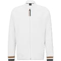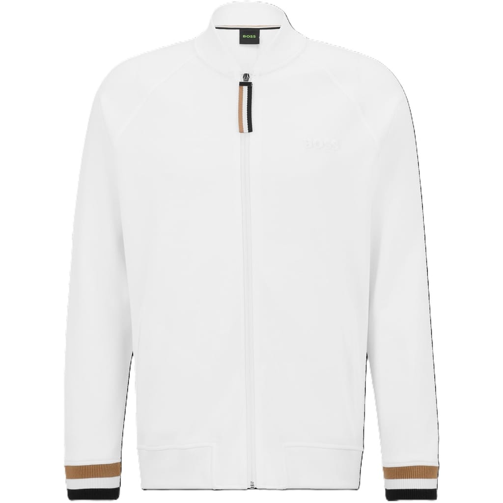 This Boss sweatshirt jacket features a mock neck and raglan sleeves, offering a comfortable regular fit. The solid pattern is complemented by a full zipper closure, while ribbed cuffs and hem add a touch of detail. A subtle logo embellishment completes the look, making it a versatile addition to your wardrobe. -