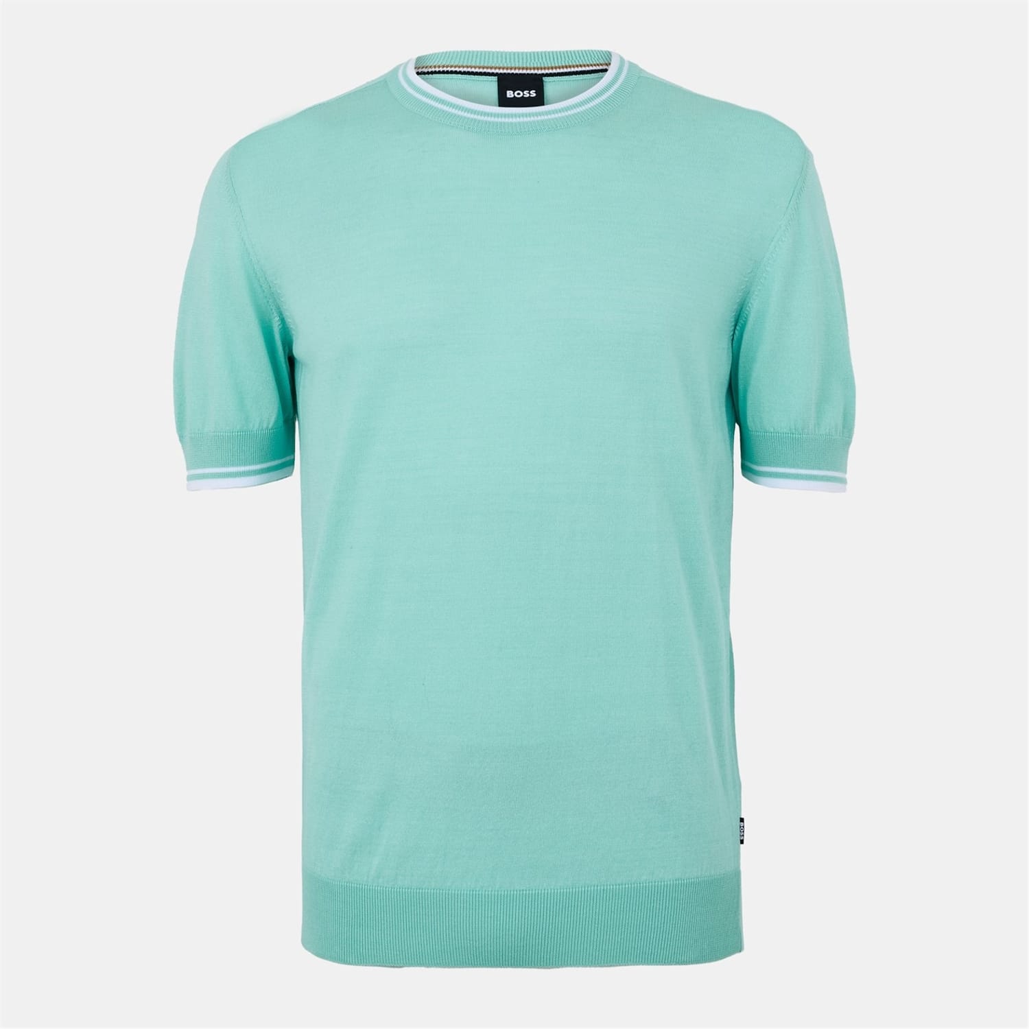 This Boss top features a solid pattern with a crew neck and short sleeves. Crafted from knit material, it offers a regular fit for comfort. The design is enhanced with a ribbed collar and ribbed cuffs, adding subtle detail. A logo embellishment completes the look, making it a stylish choice for any wardrobe. -