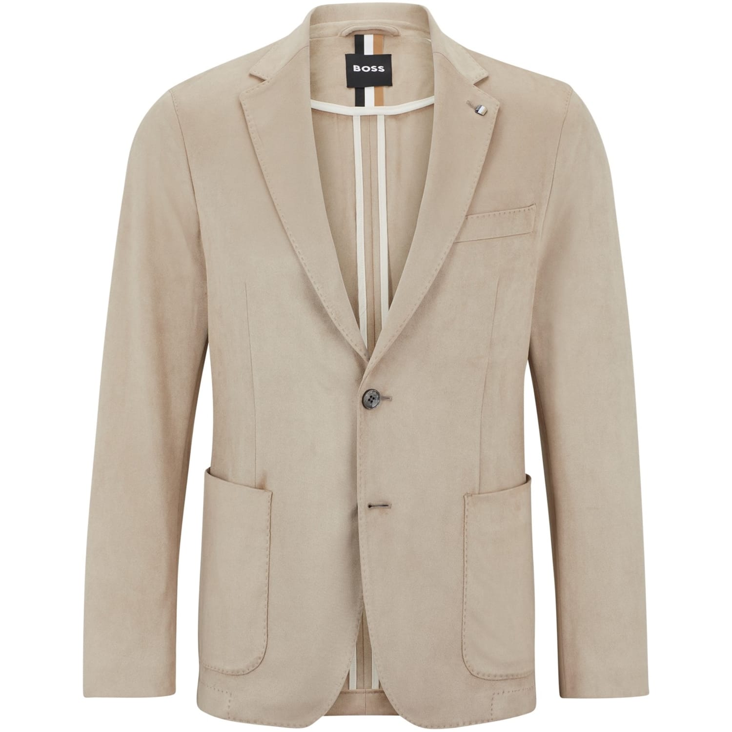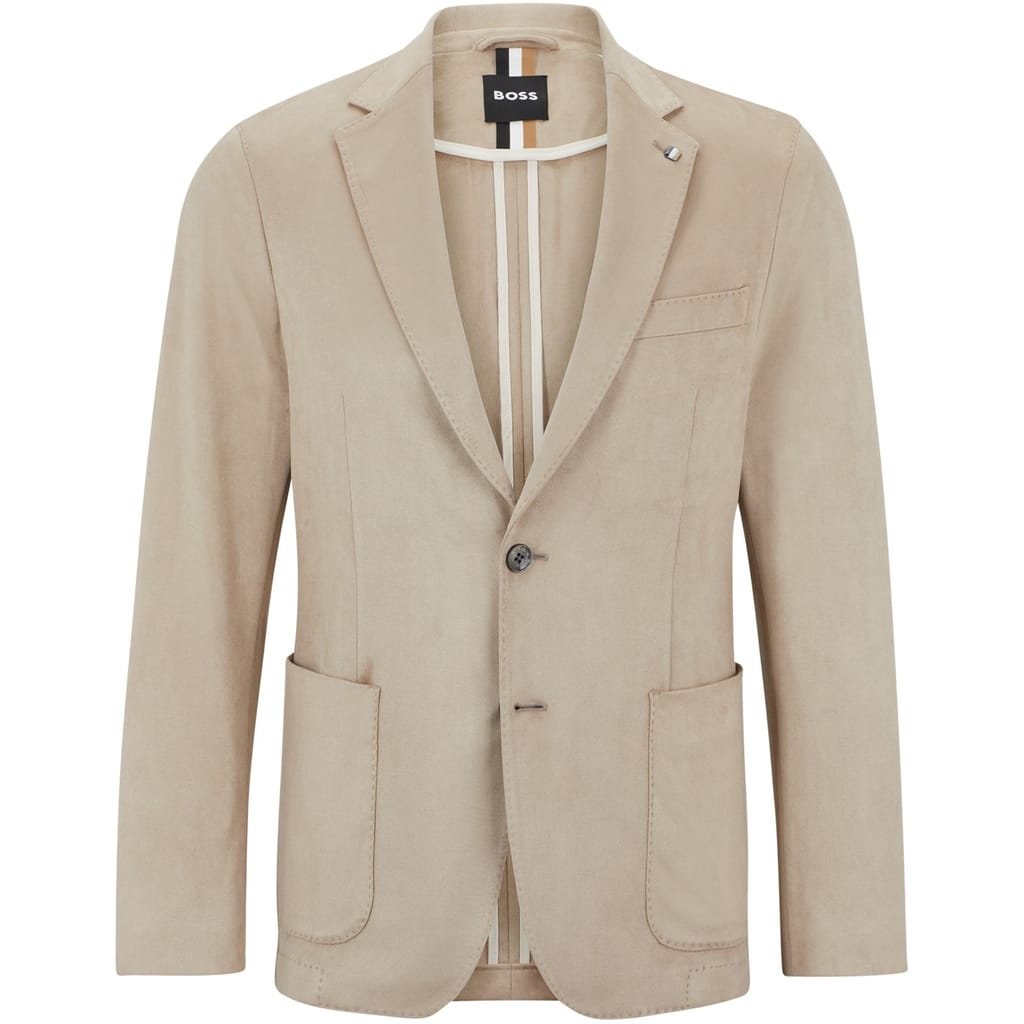 Elevate your professional wardrobe with this Boss blazer, part of the workwear collection. Featuring a notch collar and a button closure, this regular fit jacket is designed for a sleek silhouette. The solid pattern and straight hem add to its classic appeal, while the subtle logo embellishment provides a touch of brand identity. -