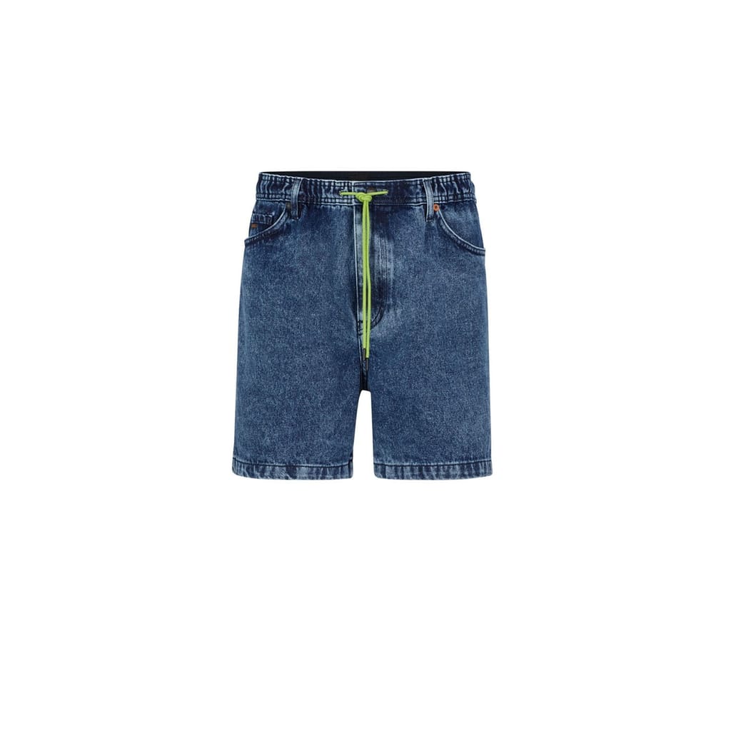 These Boss jean shorts feature a stone wash pattern, offering a stylish casual look. Designed with a drawstring closure and practical pockets, they provide both comfort and functionality. Ideal for relaxed settings, these shorts are a versatile addition to any wardrobe. -