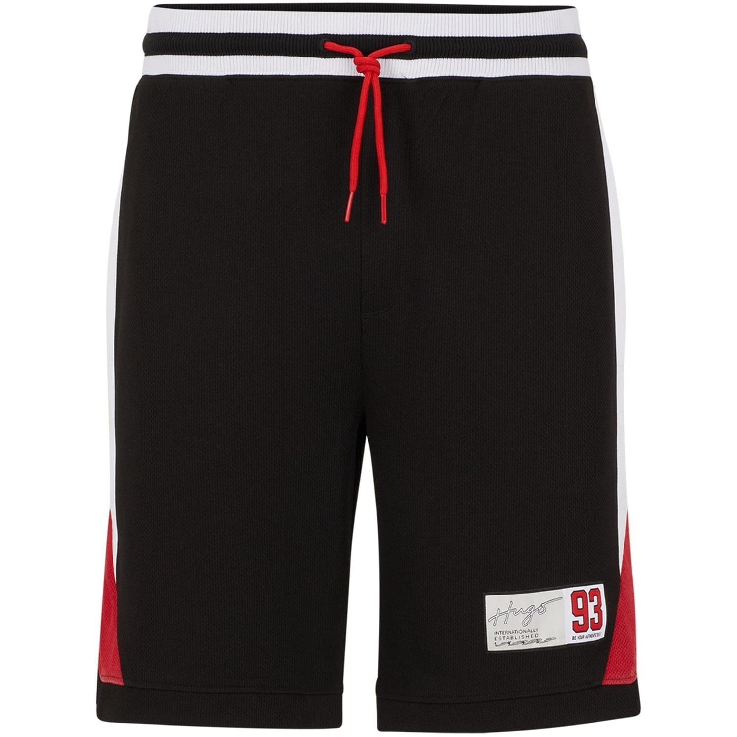 Hugo basketball shorts feature a solid pattern with a drawstring closure for a secure fit. These athletic shorts are adorned with a logo and patch pocket, adding a touch of style. The design includes lettering and a number on the back, making them a standout choice for sports enthusiasts. -