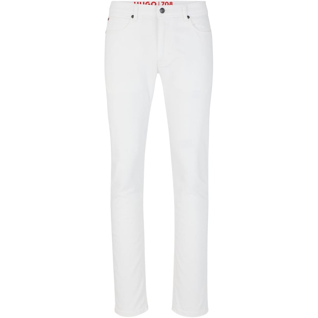Hugo jeans feature a slim fit with a classic five-pocket design. The jeans are equipped with a zip fly, front button, and belt loops for a secure fit. Embellished with front, back, and coin pockets, these jeans offer both style and functionality. -