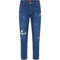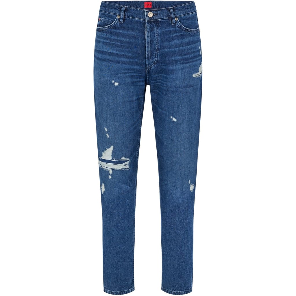 Hugo distressed jeans feature a slim fit with a zip fly and front button closure. The design includes belt loops and a five-pocket style, complete with distressed pockets, whiskers, and rivets. The washed pattern adds a unique touch, while the coin pocket offers practicality. -