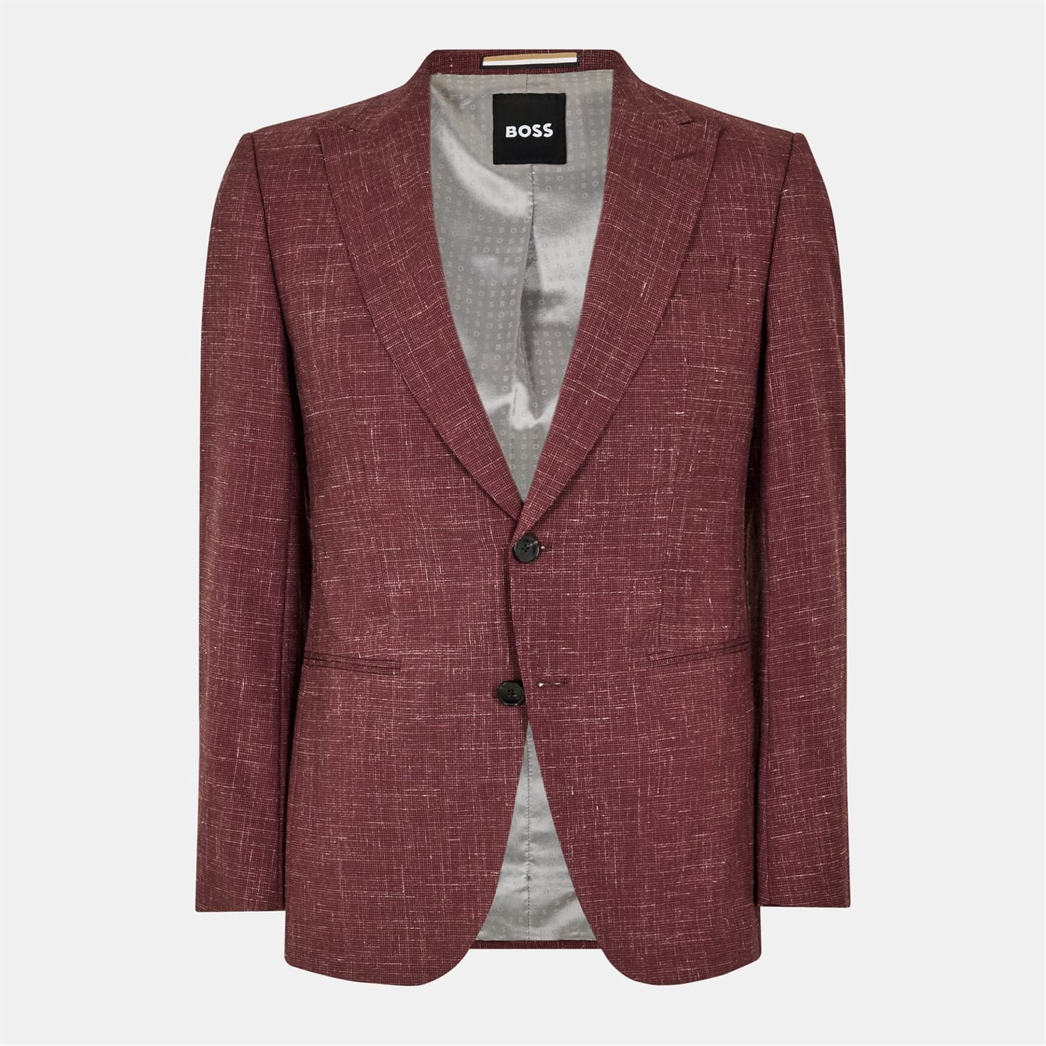 This Boss suit jacket from the formal collection features a textured pattern and a notch collar. It is designed with a straight hem and a regular fit, offering a classic look. The jacket includes a button closure and is adorned with a subtle logo embellishment, adding a touch of sophistication to your ensemble. -