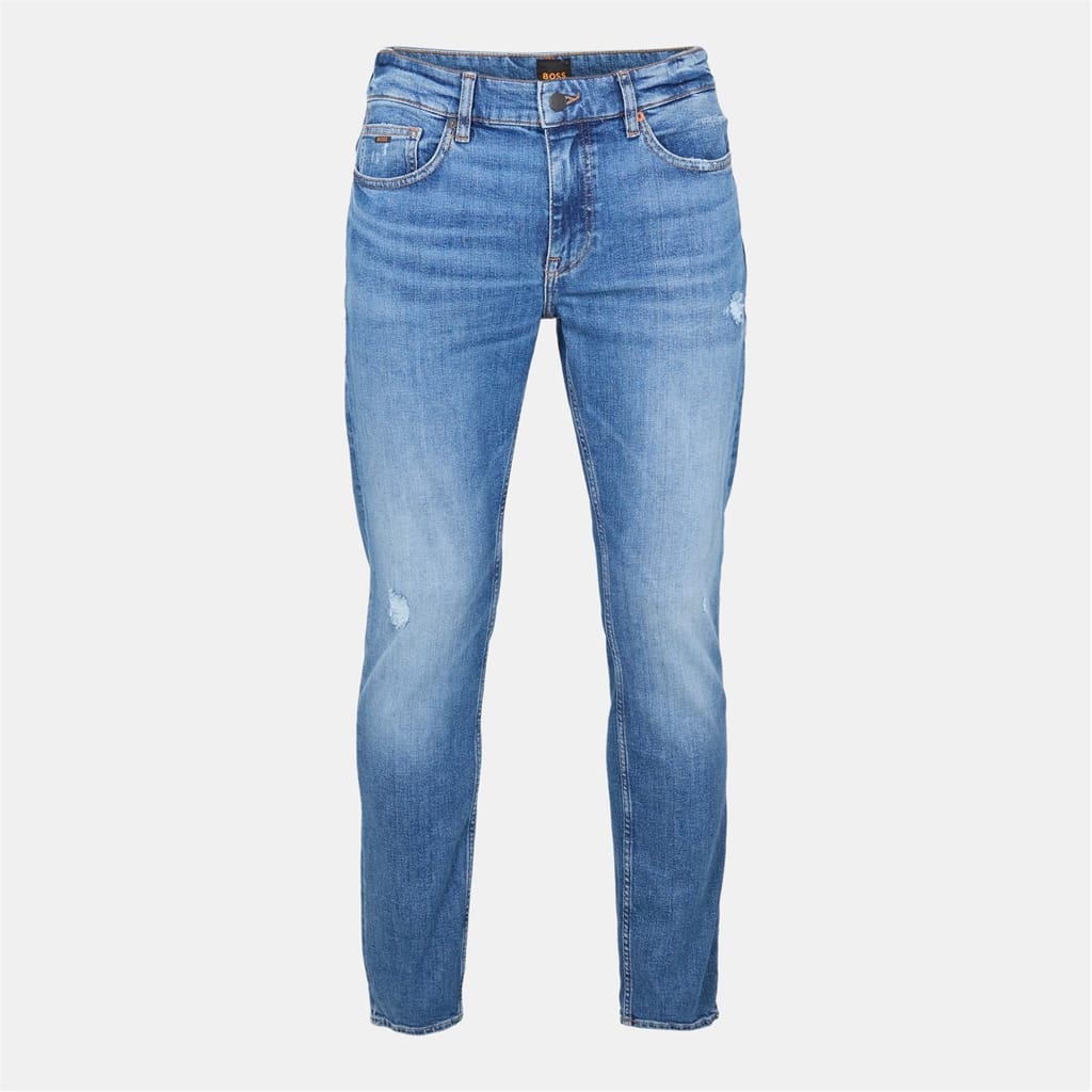Boss Delaware jeans feature a skinny fit with a five-pocket design and distressed style. The jeans come with a zip fly, front button, and belt loops for secure closure. Embellished with front, back, and coin pockets, along with detailed stitching, these jeans showcase a washed pattern for a modern look. -