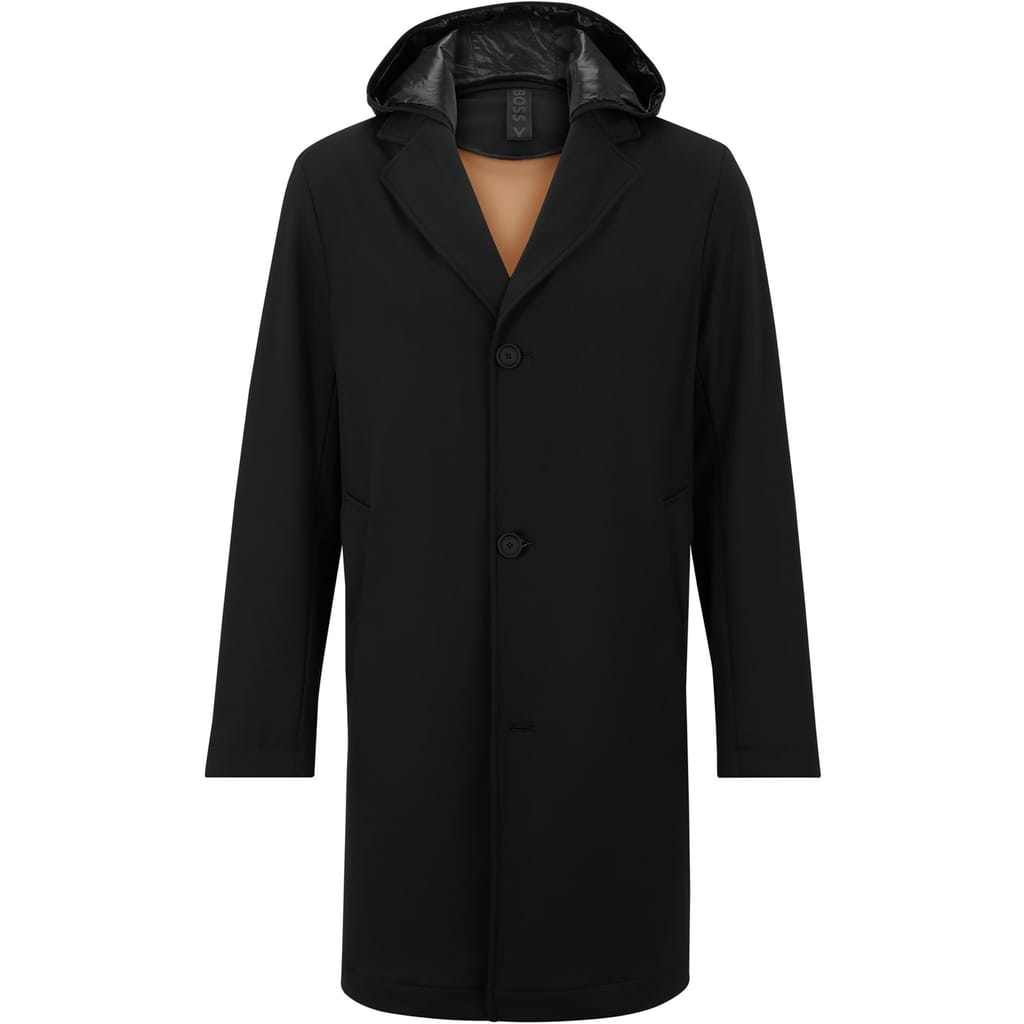 This Boss trench coat features a hooded neckline and a notch collar, offering a stylish and functional design. The coat is crafted with a solid pattern and a straight hem, providing a clean and classic look. It includes a button closure for secure fastening and showcases the brand's logo embellishment. Designed in a regular fit, this coat is a versatile addition to any wardrobe. -