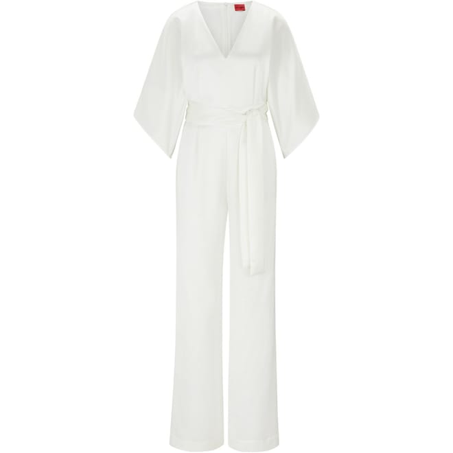 Discover the elegance of Hugo's wrap jumpsuit, featuring a V-Neck and kimono-style three-quarter sleeves. This relaxed fit piece is designed with a tie waist closure and practical pockets, offering both style and functionality. -