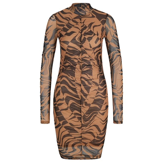 This Hugo bodycon dress features a striking animal pattern, perfect for making a statement. Designed with a high neck and long sleeves, it offers a sophisticated look. The knee-length dress has a straight hem, ensuring a sleek silhouette. Its slim fit accentuates the figure, making it an ideal choice for those seeking a stylish and contemporary outfit. -