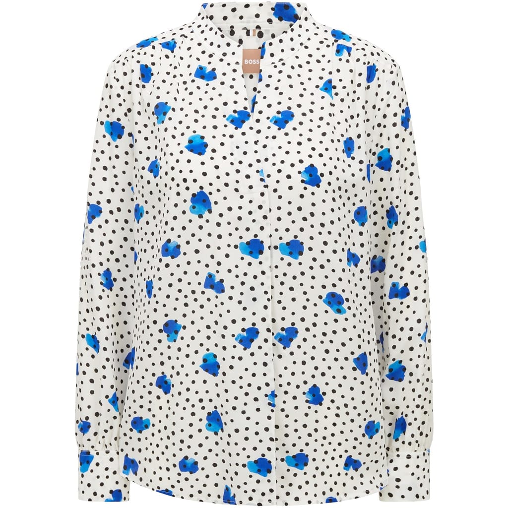 This Boss top features a charming polka dot pattern, adding a playful touch to your wardrobe. Designed with long sleeves, it offers a stylish and comfortable fit. The floral accents further enhance its appeal, making it a versatile choice for various occasions. -