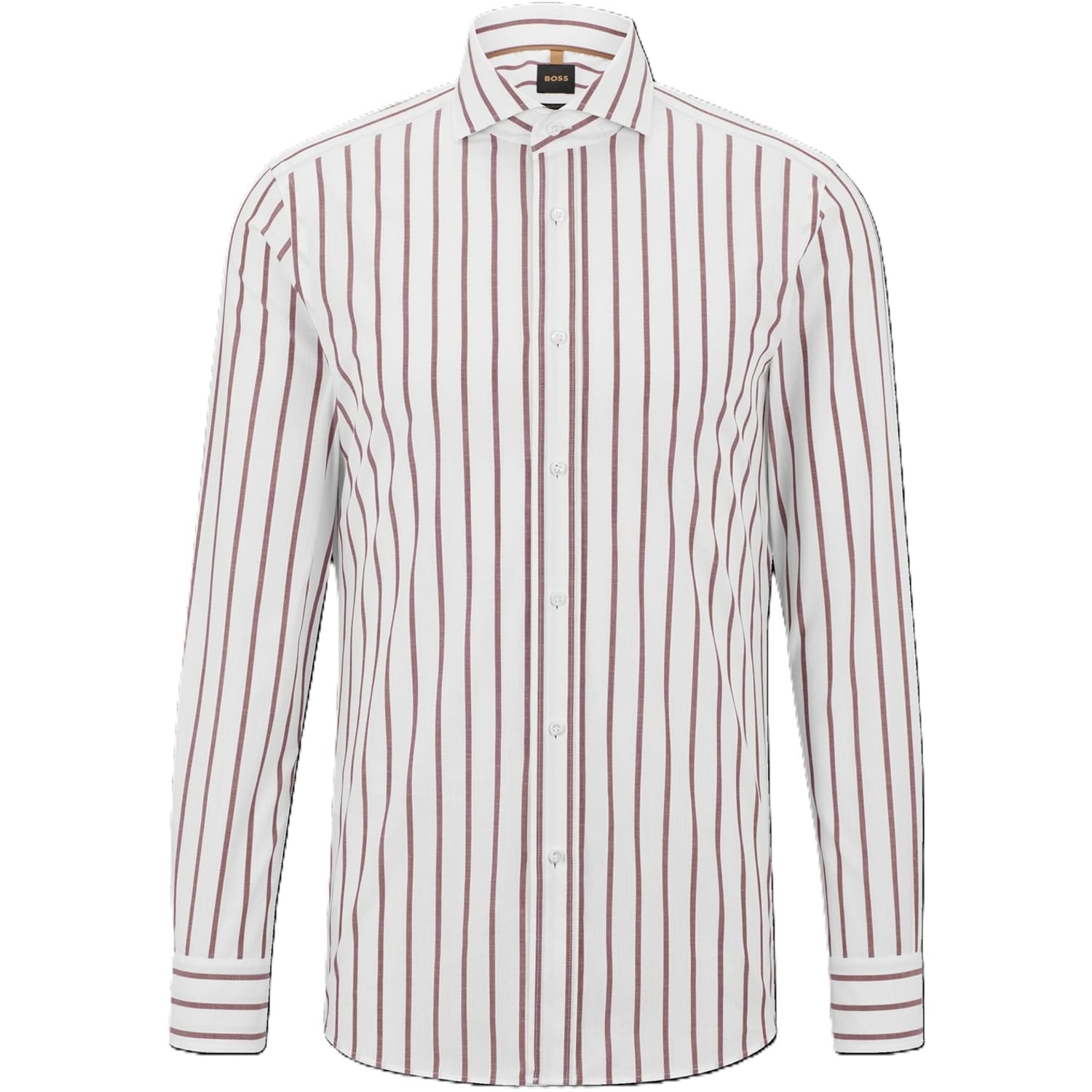 This Boss top is a formal piece featuring a regular fit and long sleeves with barrel cuffs. It showcases a spread collar and a button closure, complemented by a vertical stripe pattern. The top is adorned with a subtle logo embellishment, adding a touch of sophistication to its design. -