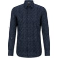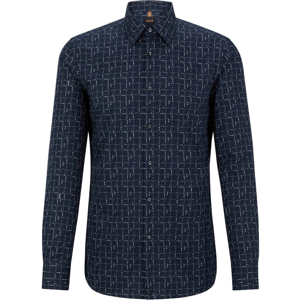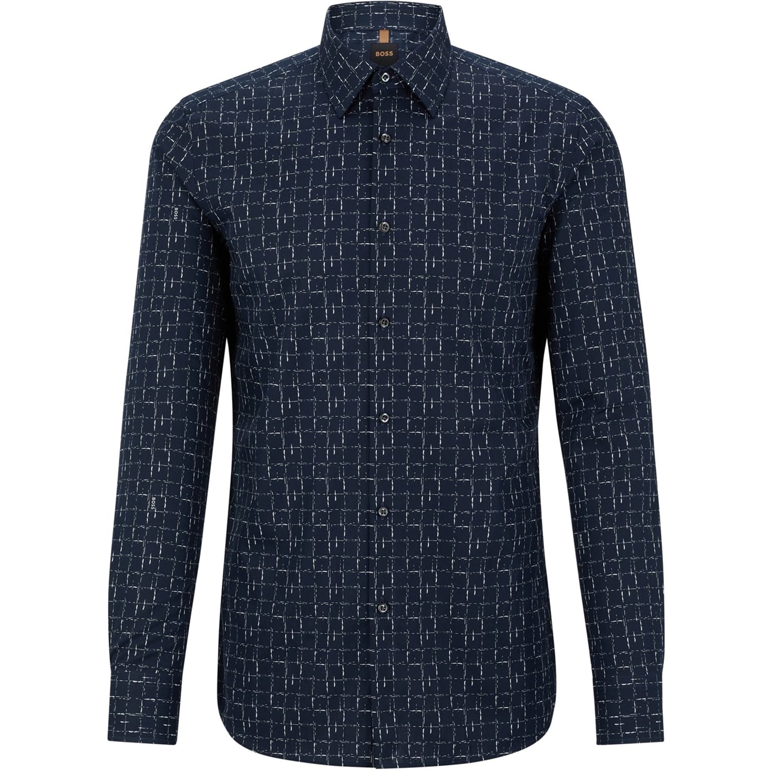 This Boss top is a formal long-sleeve shirt featuring a checkerboard pattern. It has a button closure and a point collar, complemented by a barrel cuff. The regular fit ensures comfort, while the logo embellishment adds a touch of brand identity. -