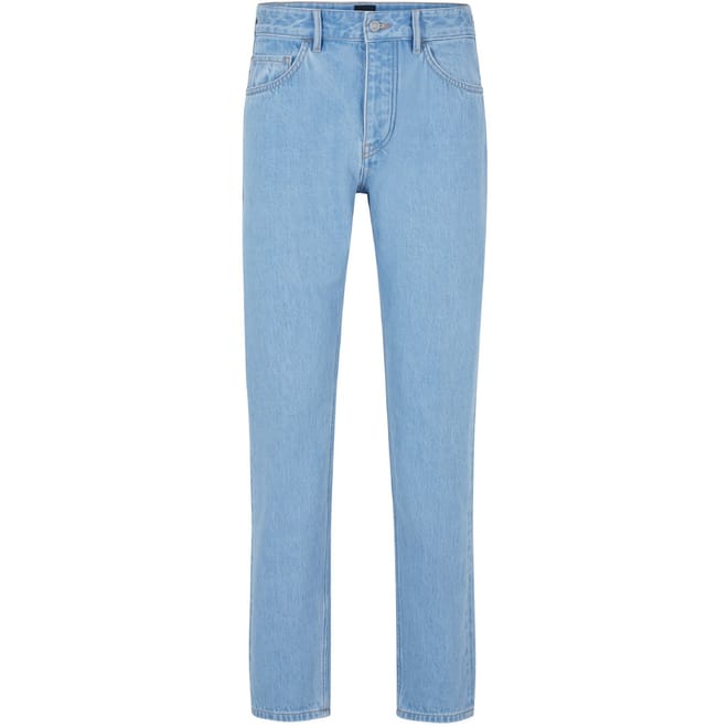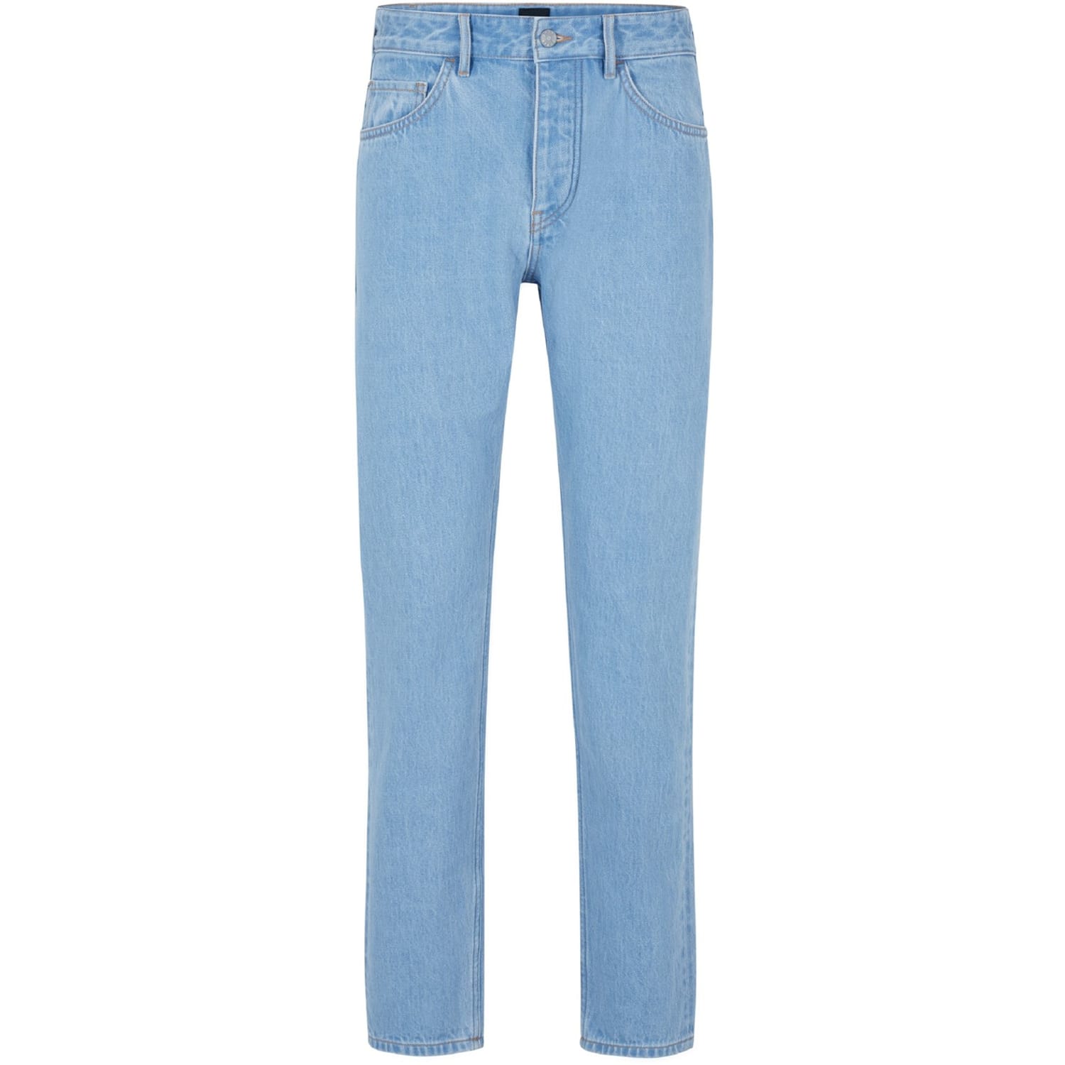 Boss jeans feature a straight fit with a classic five-pocket design. The zip fly and front button closure, along with belt loops, ensure a secure fit. Embellished with pockets, including a coin pocket, front and back pockets, and detailed stitching with rivets, these jeans offer both style and functionality. -