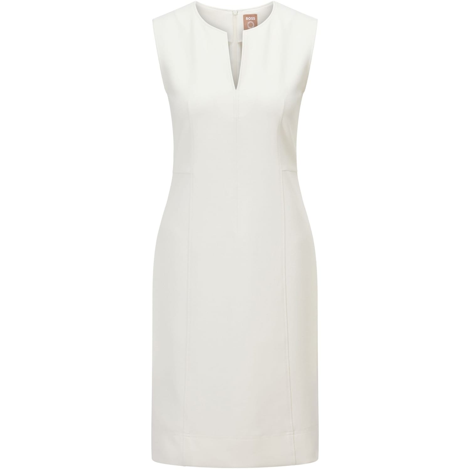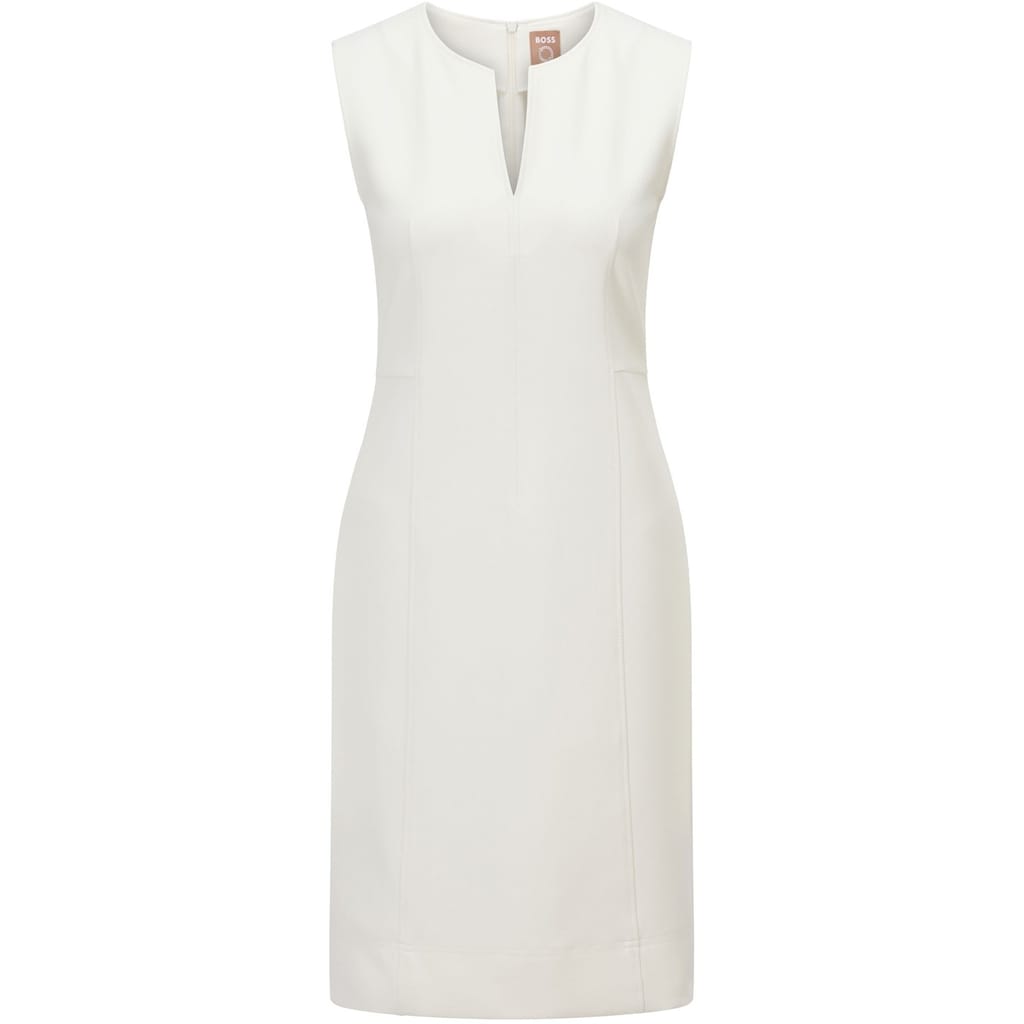 This Boss sheath dress is a sophisticated choice for any occasion. Crafted in a solid pattern, it features a notched neckline and a knee-length design. The slim fit accentuates the silhouette, while the straight hem adds a touch of elegance. Perfect for those seeking a refined and timeless look. -
