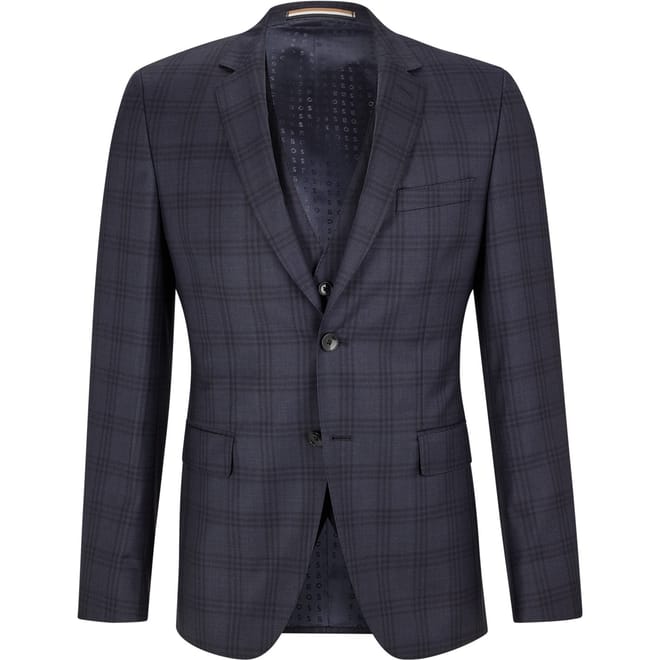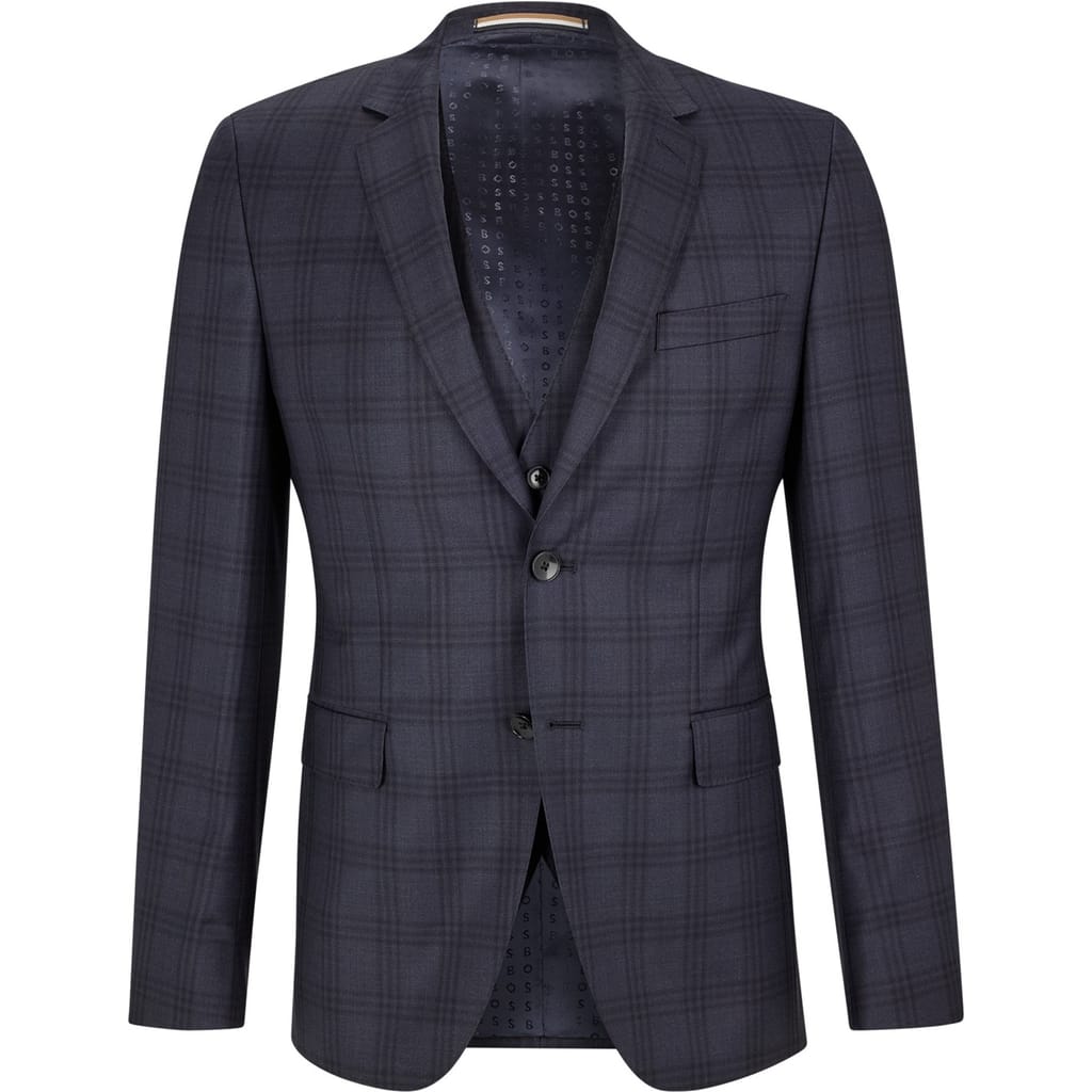 The Boss Reymond suit jacket is a formal piece featuring a classic plaid pattern. It is designed with a notch collar and a straight hem, offering a regular fit. The jacket includes a button closure and practical pockets, making it a versatile addition to any wardrobe. -