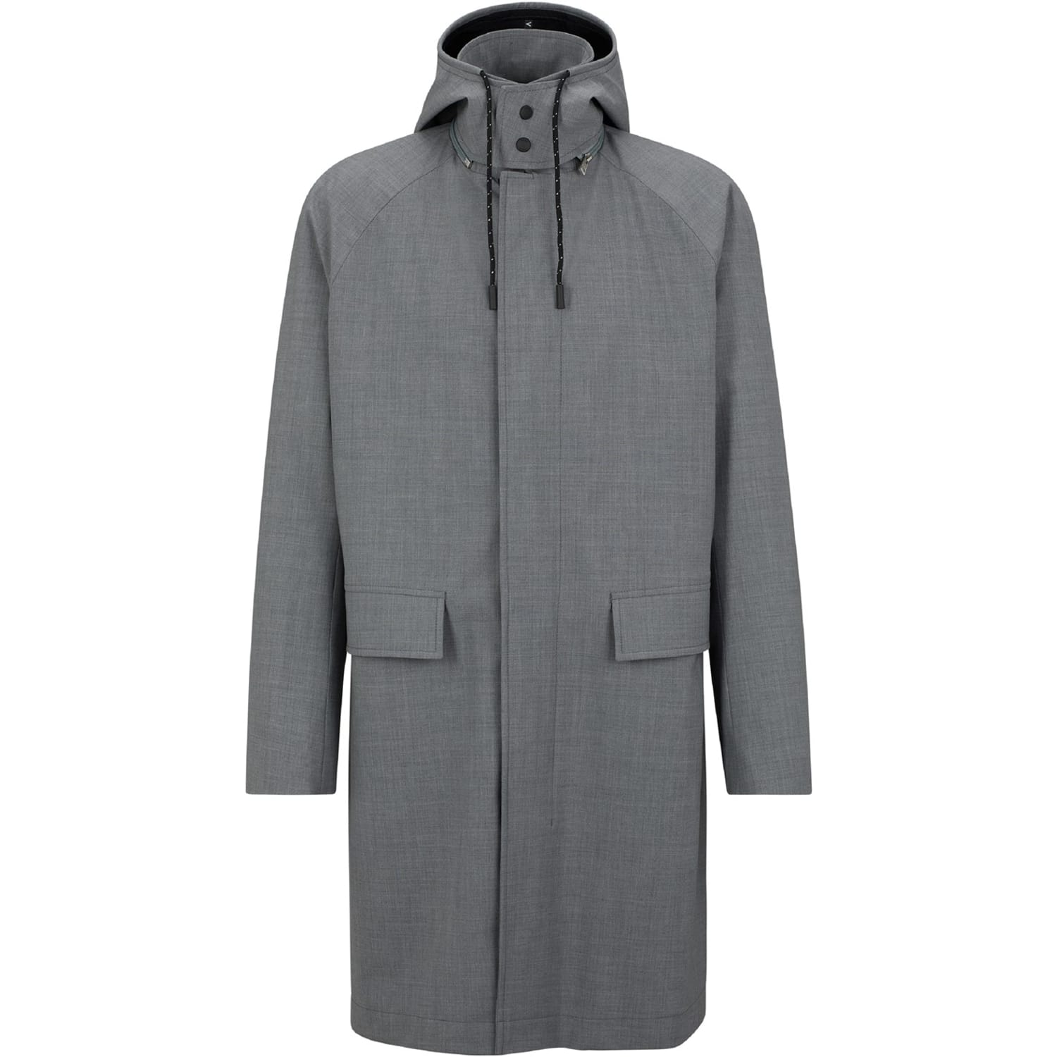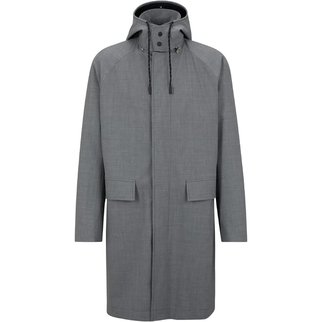 This Boss overcoat features a hooded neckline and a snap button closure, offering a practical yet stylish design. The raglan sleeves and regular fit ensure comfort and ease of movement. With a solid pattern and straight hem, this coat is both versatile and timeless. Additional pockets provide functionality, making it a perfect choice for any wardrobe. -