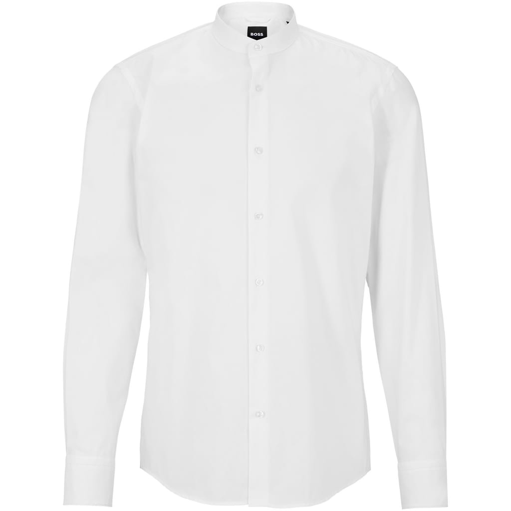 This Boss top is a formal piece featuring a band collar and long sleeves with barrel cuffs. It has a button closure and a regular fit, making it a versatile addition to any wardrobe. The solid pattern is complemented by a subtle logo embellishment, adding a touch of sophistication to the design. -