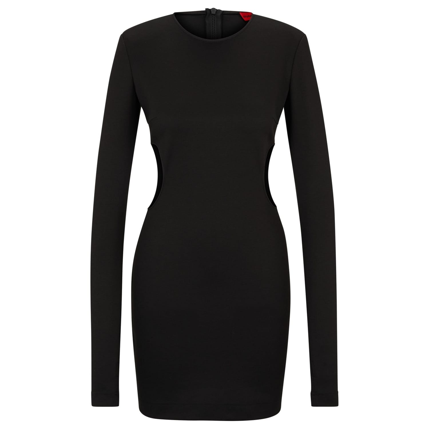This Hugo bodycon dress is a striking mini-length piece featuring a crew neck and long sleeves. The solid pattern and cut-out embellishments add a touch of elegance, while the slim fit ensures a flattering silhouette. A straight hem and zipper closure complete the design, making it a sophisticated choice for any occasion. -