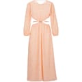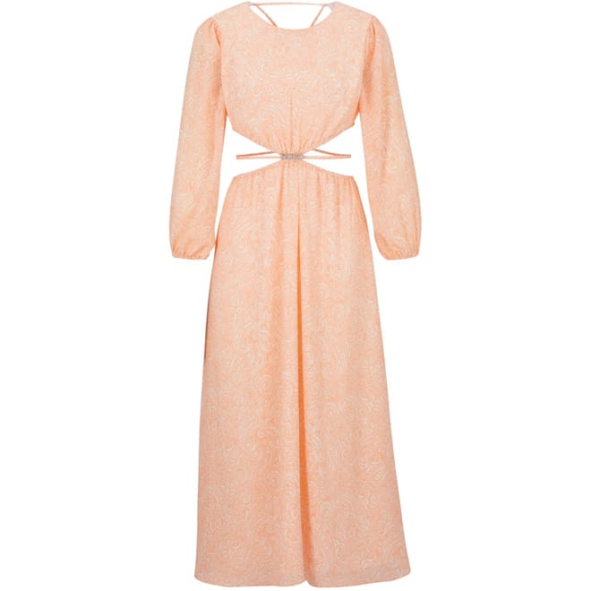 This Hugo maxi dress features a striking paisley pattern and a crew neck, offering a sophisticated look. The dress is designed in an A-line style with a regular fit, ensuring comfort and elegance. It includes a tie closure and a straight hem, while the cut-out embellishments add a unique touch to the overall design. -
