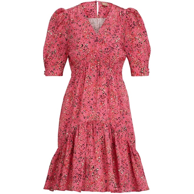 This Boss mini dress features a striking leopard pattern, perfect for making a statement. The tiered design is complemented by a v-neck and puff sleeves, adding a touch of elegance. The ruffle hem and embellishments enhance its playful charm, while the regular fit ensures comfort and style. -
