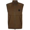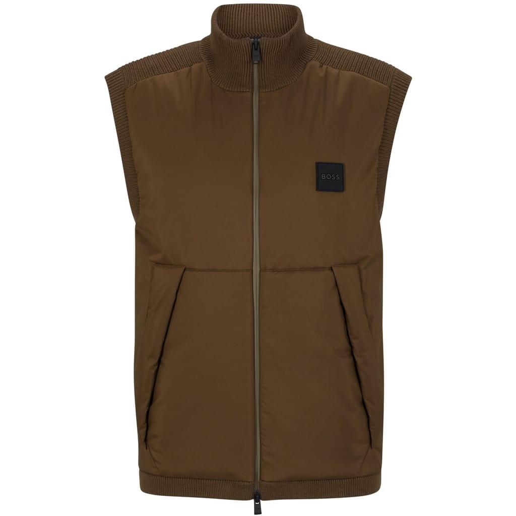 This Boss knit gilet features a solid pattern and a regular fit, offering a sleek and versatile addition to your wardrobe. The design includes a zipper closure and ribbed hem, ensuring a comfortable fit. Embellished with practical pockets and a subtle logo, this piece combines functionality with understated style. -