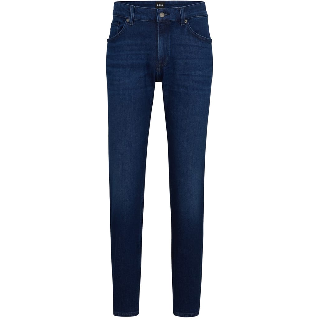 Discover Boss jeans featuring a straight fit and a classic five-pocket design. These jeans are equipped with a zip fly, front button, and belt loops for a secure fit. Embellished with front, back, and coin pockets, along with stitching and rivets, they offer both style and functionality. -