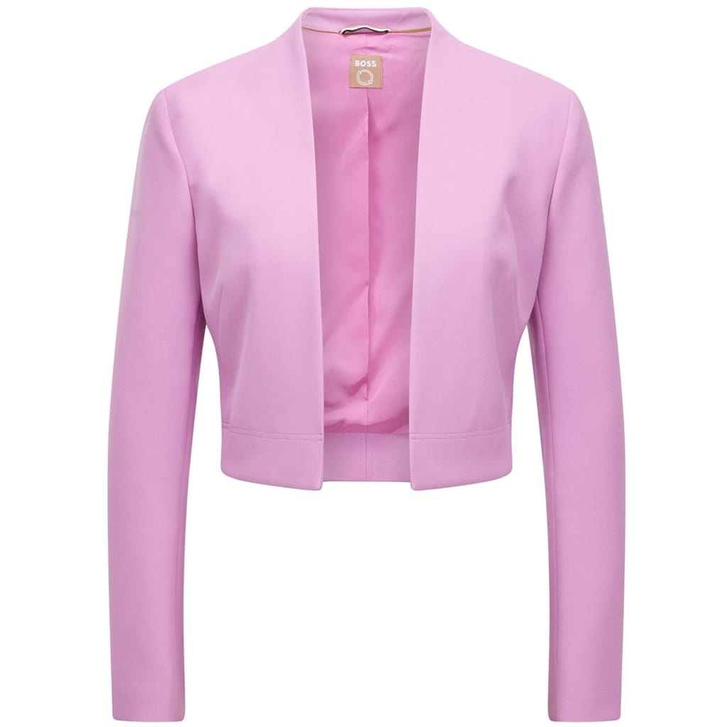 This Boss blazer from the workwear collection is a sophisticated choice for professional settings. Featuring a solid pattern and a regular fit, it offers a sleek silhouette. The short length and straight hem add to its modern appeal, while the open front design ensures ease of wear. A subtle logo embellishment completes the look, making it a refined addition to your wardrobe. -