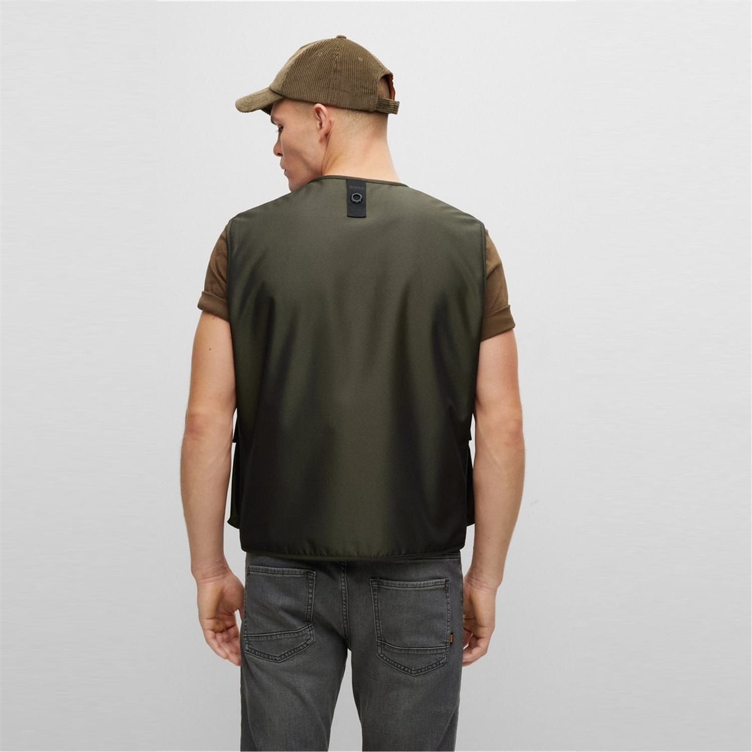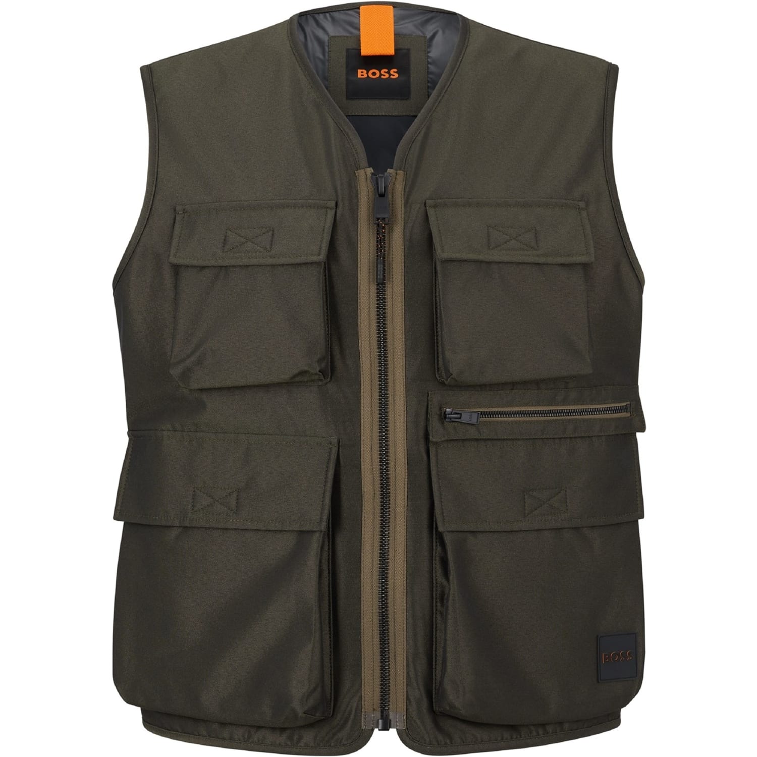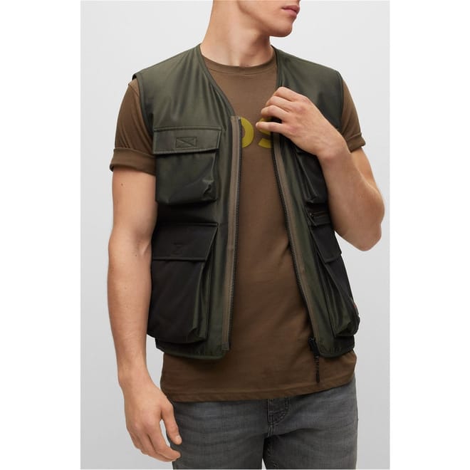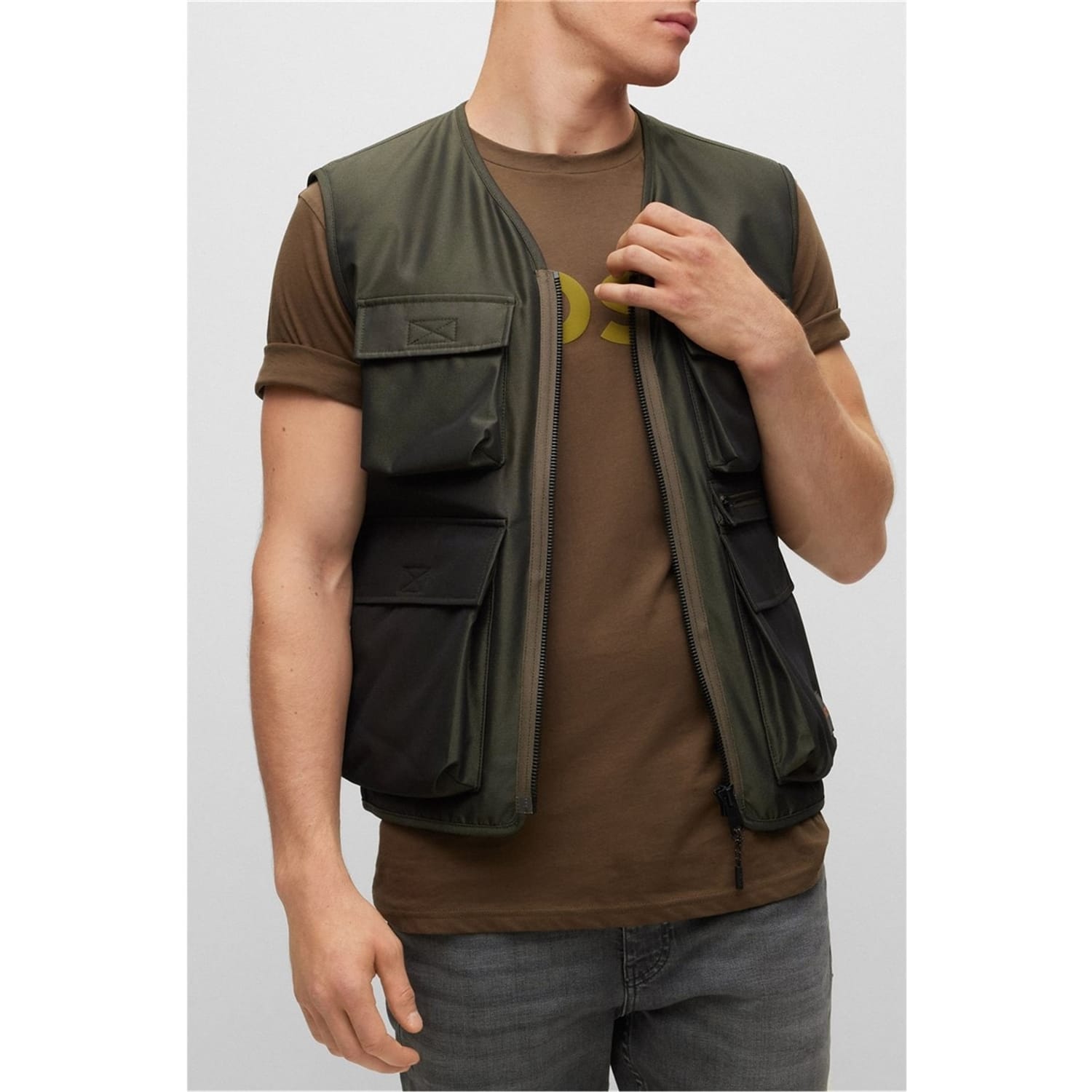 This Boss gilet features a sleek solid pattern and a practical zipper closure. Designed with convenient pockets, it offers both style and functionality. The sleeveless design makes it a versatile layering piece for various occasions. -