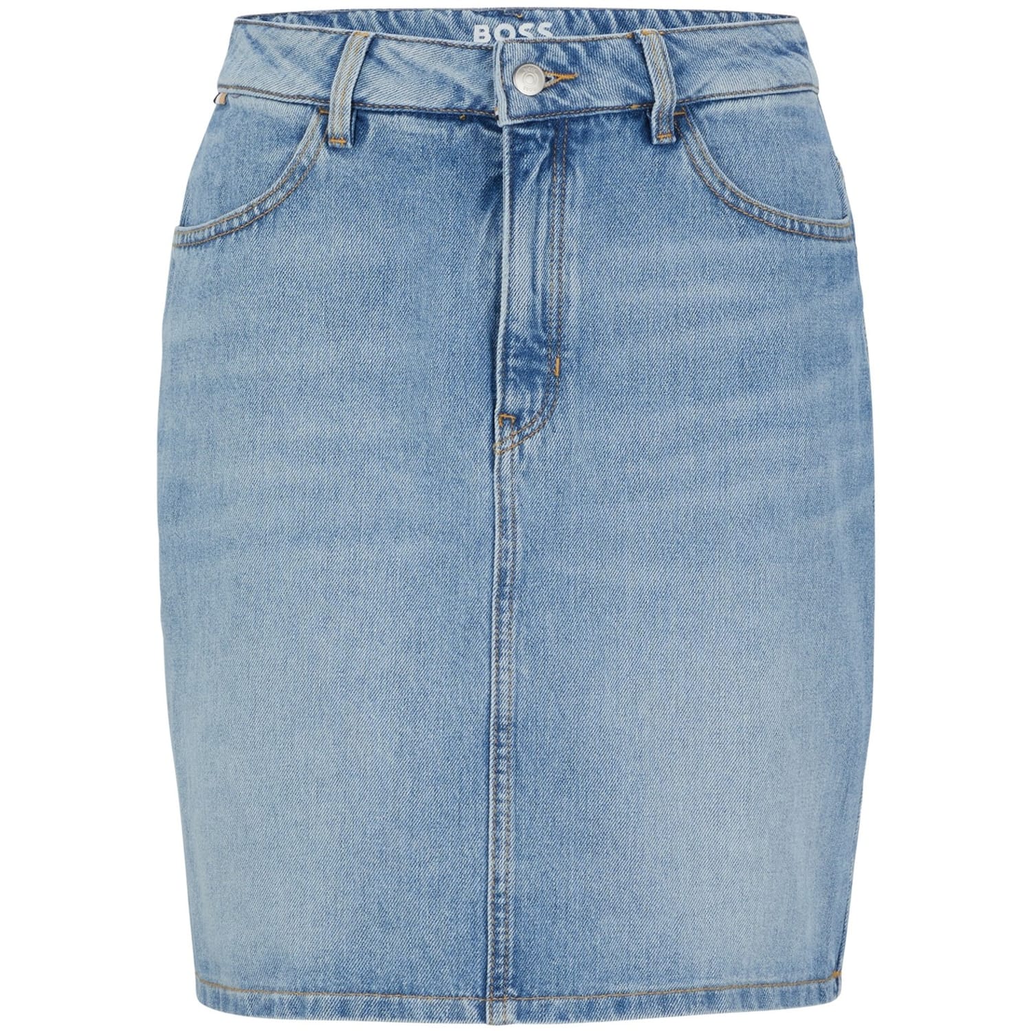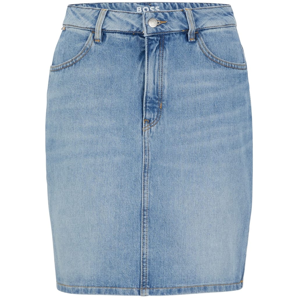This Boss knee-length skirt is a stylish addition to any casual collection. Featuring a slim fit, it is designed with a button and zip fly closure for a secure fit. The 5-pocket style includes front and back pockets, adding practicality. The skirt is embellished with a subtle logo, enhancing its modern appeal. -