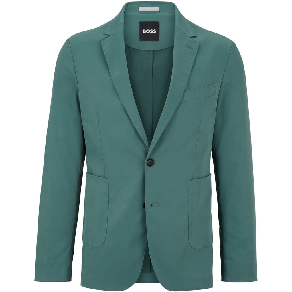 This Boss blazer from the workwear collection is a sophisticated choice for professional settings. It features a lapel collar, button closure, and a straight hem, offering a regular fit. The solid pattern and pocket embellishments add to its classic appeal, making it a versatile addition to any wardrobe. -