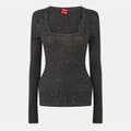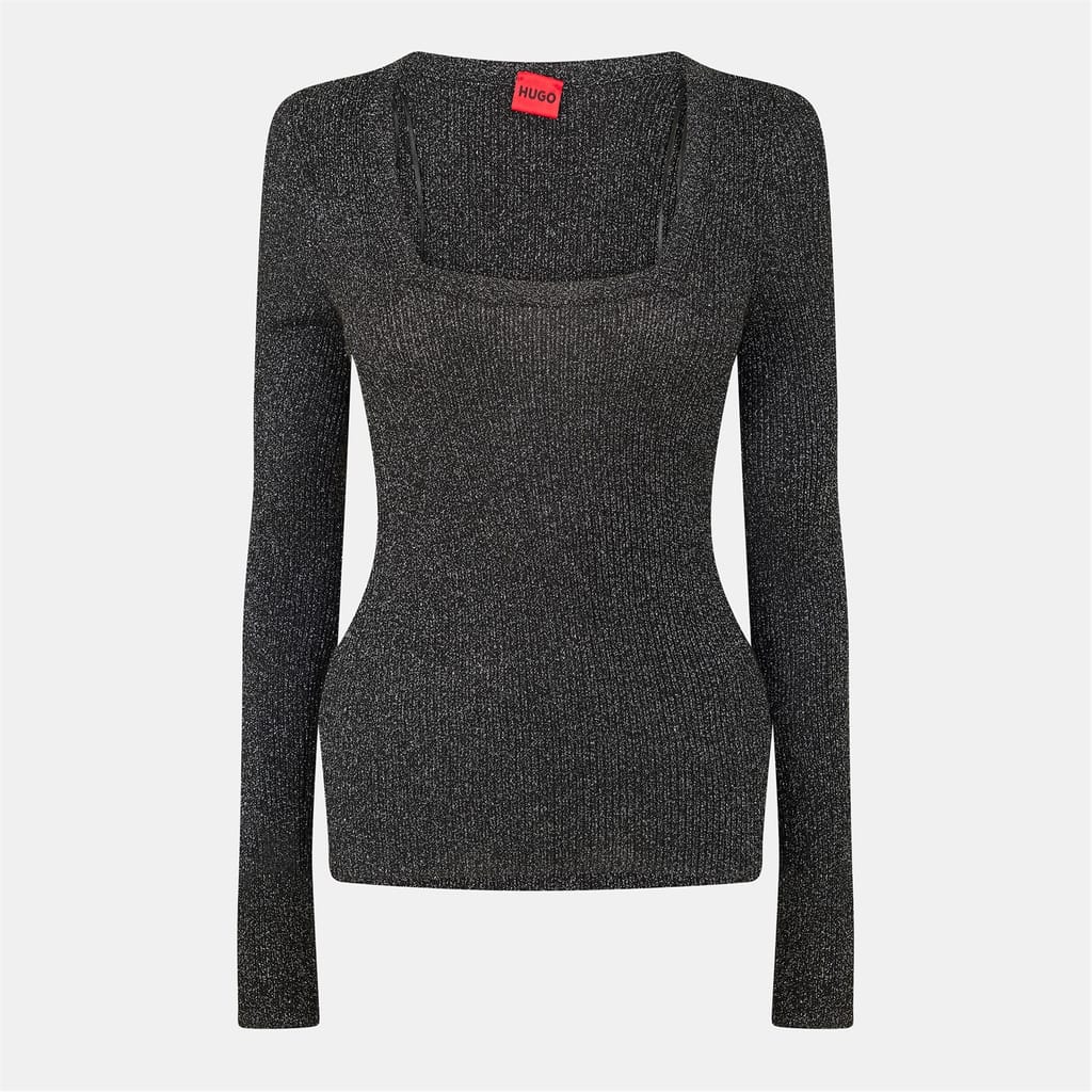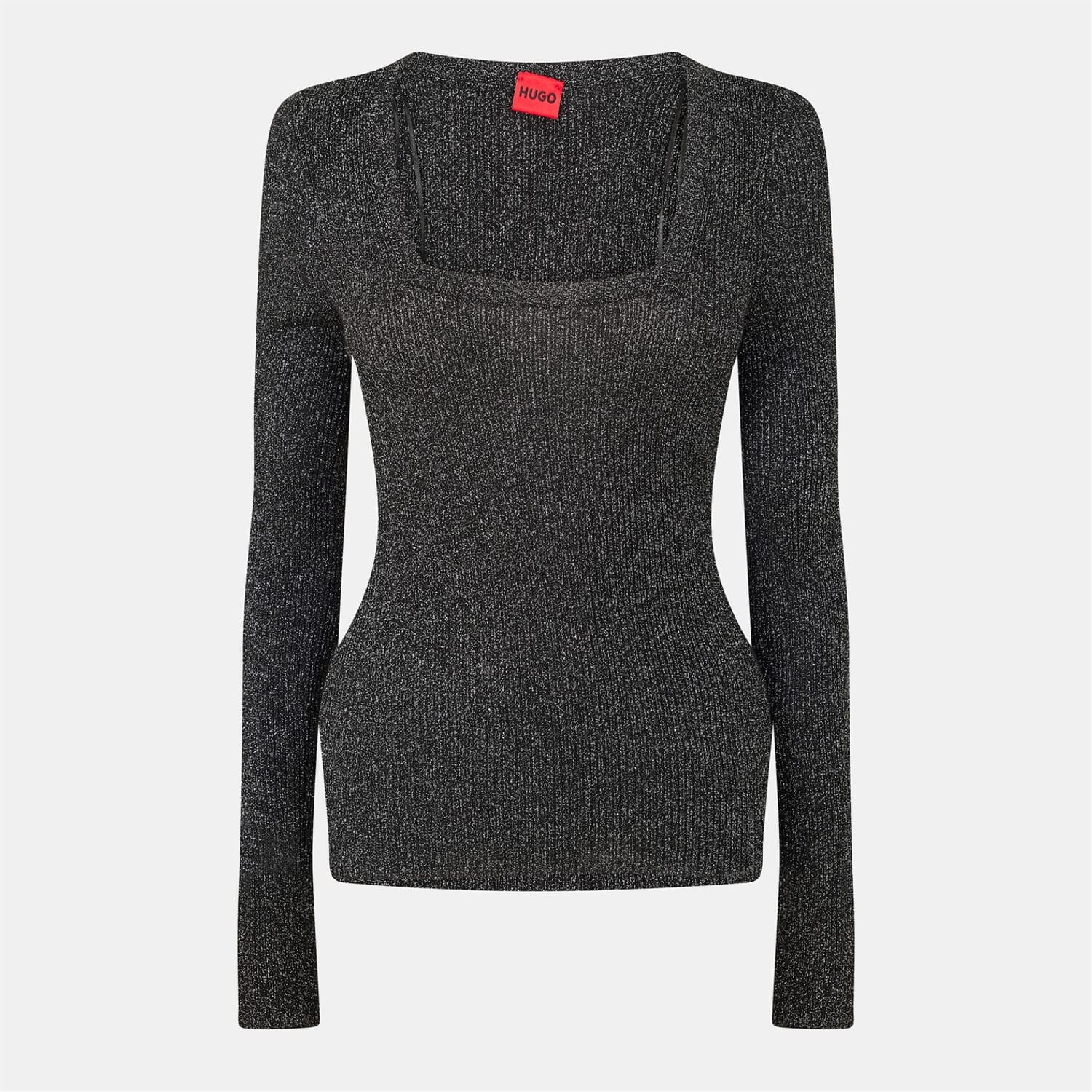 This Hugo top features a square neck and long sleeves, offering a sleek slim fit. The ribbed pattern adds texture, while the subtle logo embellishment provides a touch of brand identity. -