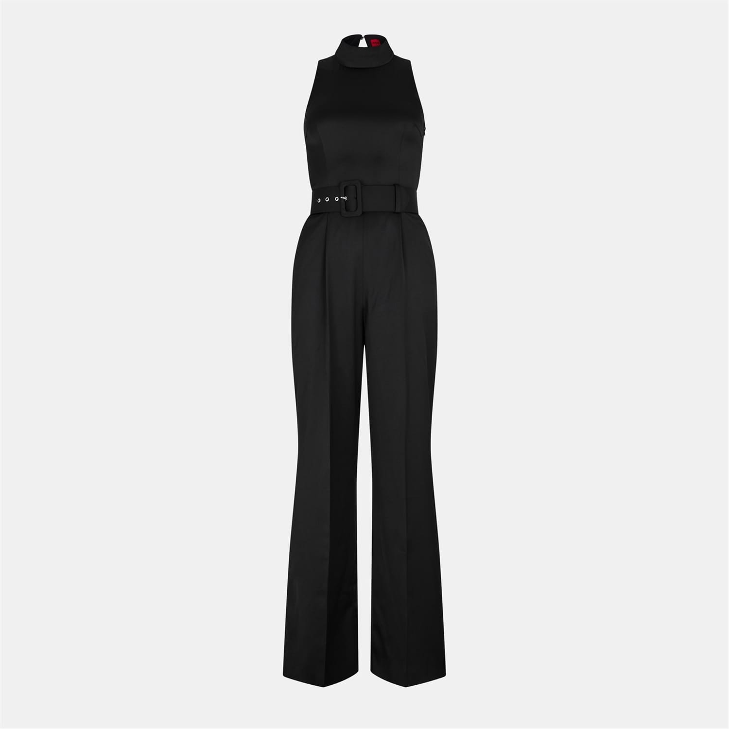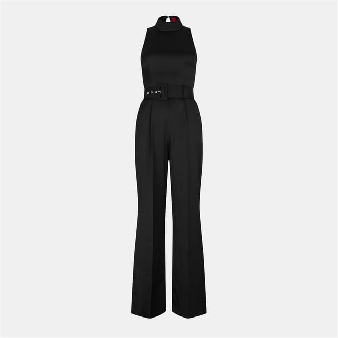 This Hugo wrap jumpsuit features a halter neck and sleeveless design, offering a chic and modern look. The jumpsuit is secured with a buckle closure and belt, ensuring a comfortable fit. Crafted in a regular fit, it provides both style and ease for any occasion. -