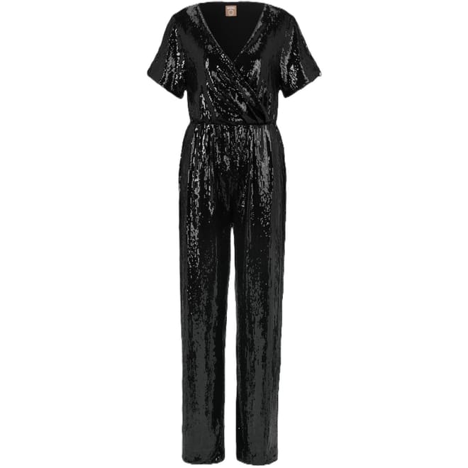 Elevate your wardrobe with this Boss wrap jumpsuit, featuring a striking metallic pattern and sequin embellishments. The V-Neck design and short plain sleeves offer a sophisticated touch, while the regular fit ensures comfort and style. -