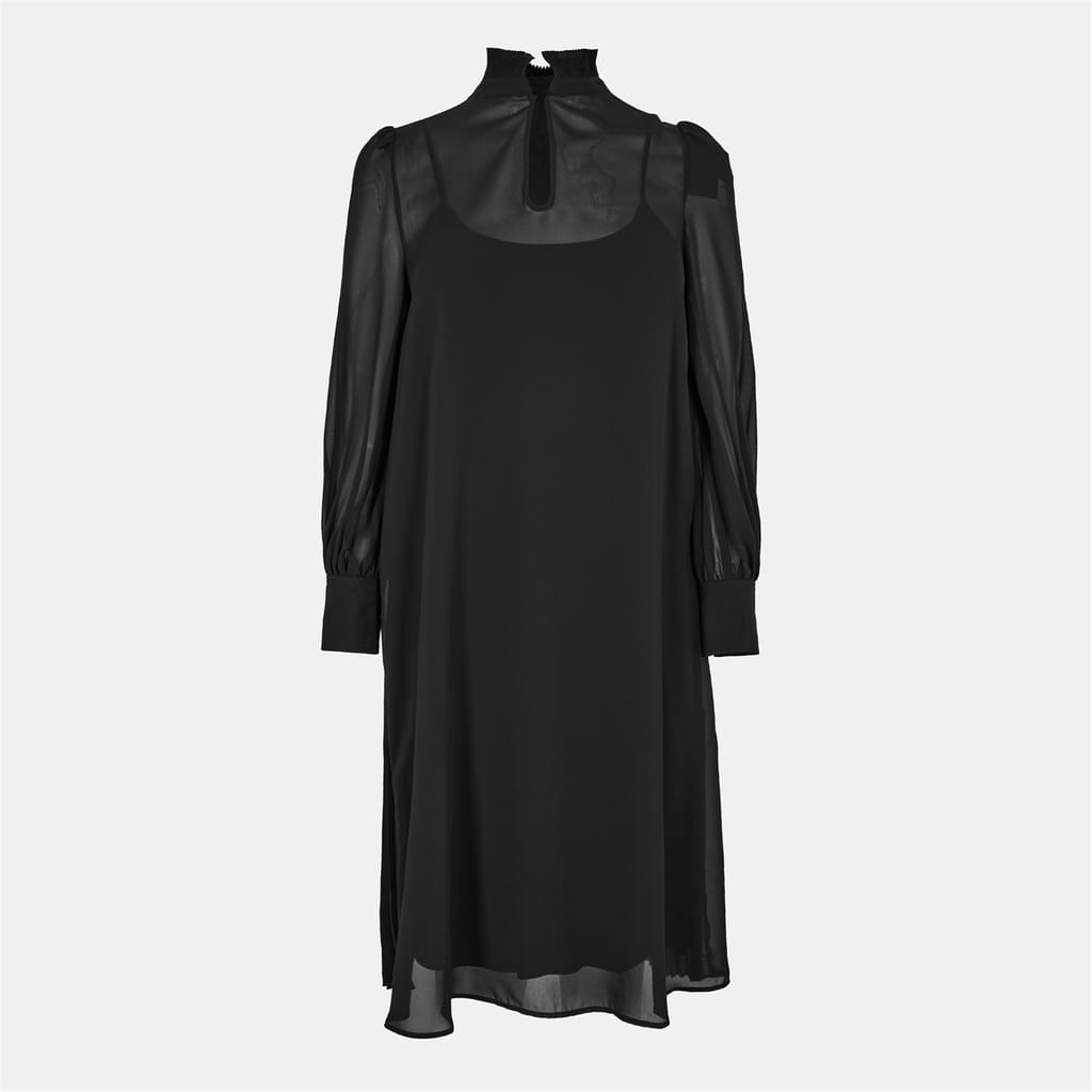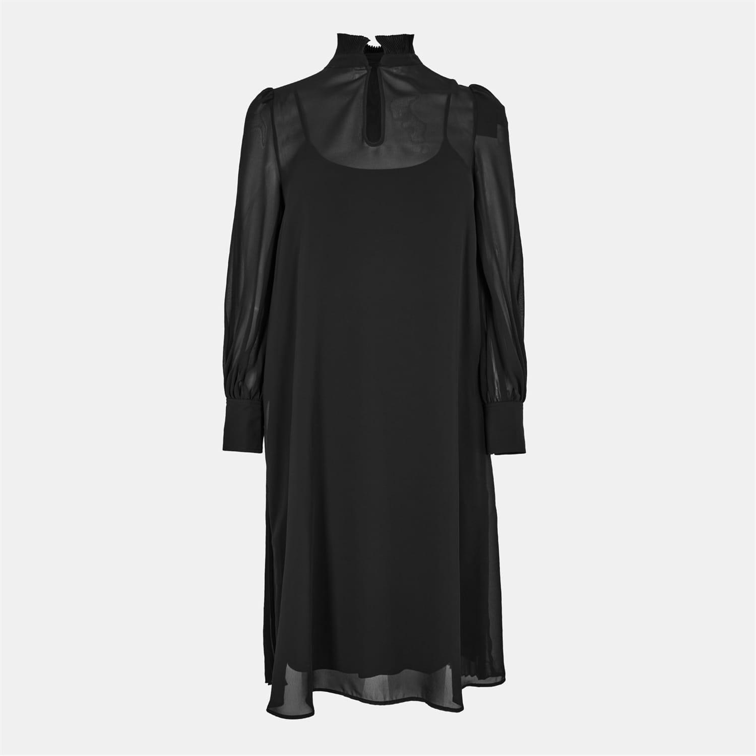 This Boss shift dress features a sophisticated high collar and mock neck design, offering a refined look. The midi length and curved hemline provide a classic silhouette, while the long bishop sleeves add a touch of elegance. Crafted in a solid pattern, this regular fit dress is perfect for any occasion. -