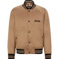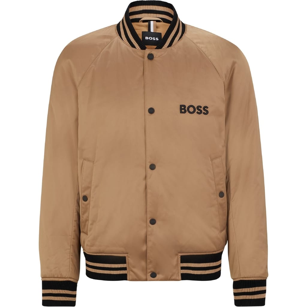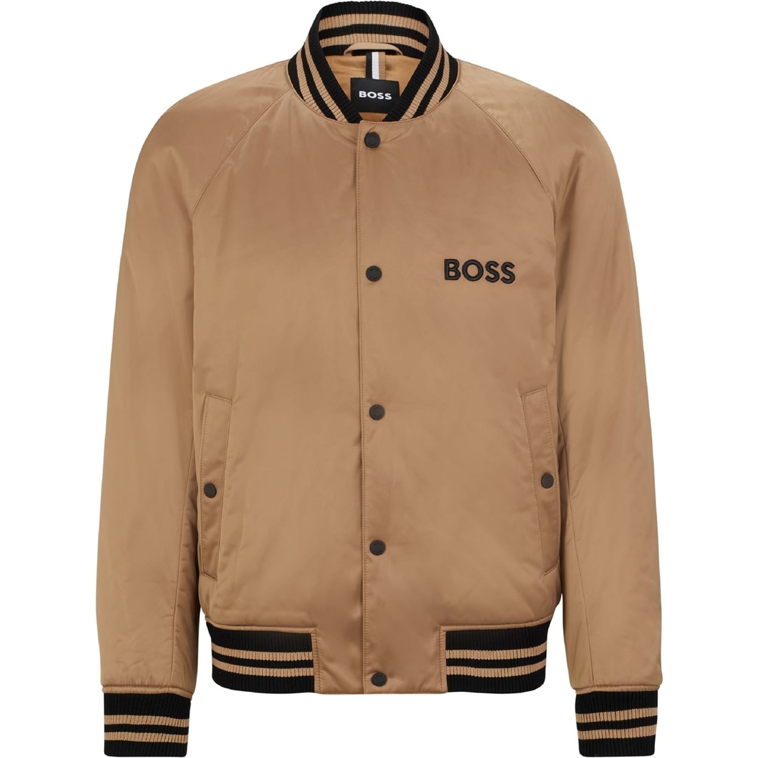 This Boss varsity jacket features a ribbed crew neck and raglan sleeves, offering a comfortable regular fit. The short length and solid pattern provide a classic look, while the snap button closure adds practicality. Embellished with a logo and side pockets, it includes ribbed cuffs, collar, and hem for a refined finish. -