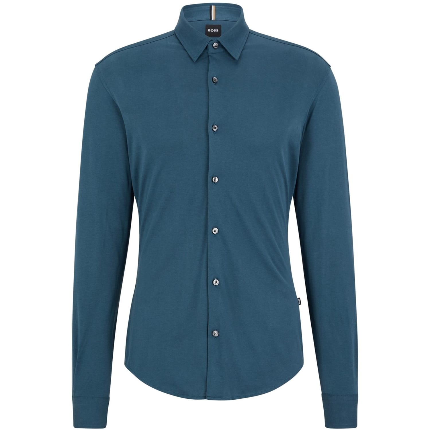 This Boss top is a formal piece featuring a solid pattern and a shirt collar. Designed with long sleeves and a button closure, it offers a slim fit for a sleek silhouette. The top is embellished with a logo, adding a touch of brand identity. -