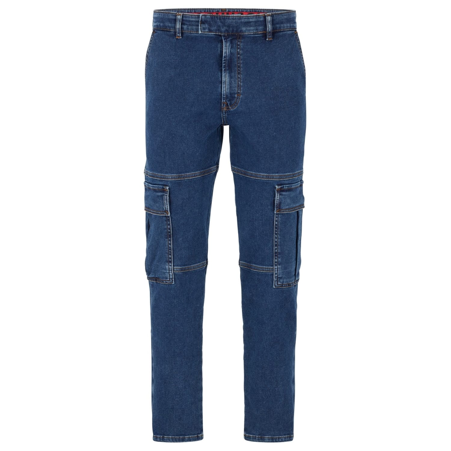 Hugo carpenter jeans feature a slim fit with a zip fly and button closure. These jeans are designed with practical patch, flap, side, and tool pockets, complemented by detailed stitching. Belt loops add functionality, making them a versatile choice for any wardrobe. -
