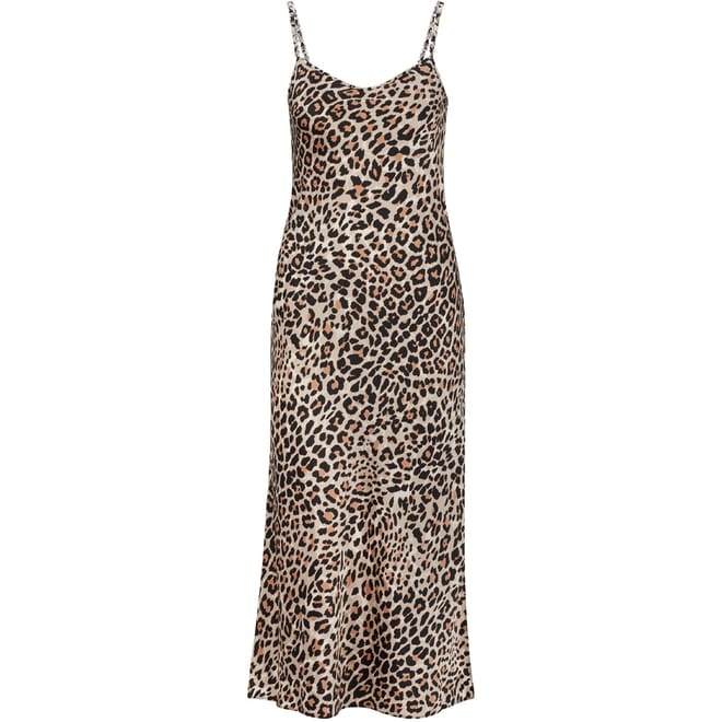 This Hugo slip dress features a striking leopard pattern, perfect for making a statement. The midi length and scoop neckline offer a sophisticated touch, while the slim fit ensures a flattering silhouette. The straight hem adds a clean finish to this elegant piece, ideal for various occasions. -